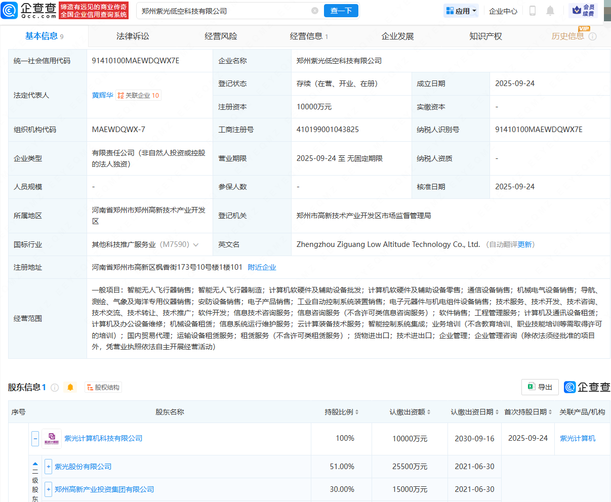 企查查APP显示,近日,郑州紫光低空科技有限公司成立,法定代表人为黄辉华,注册资本为1亿元,经营范围包含:智能无人飞行器销售;智能无人飞行器制造;导航、测绘、气象及海洋专用仪器销售等。企查查股权穿透显示,该公司由紫光股份(000938)控股的紫光计算机科技有限公司全资持股。