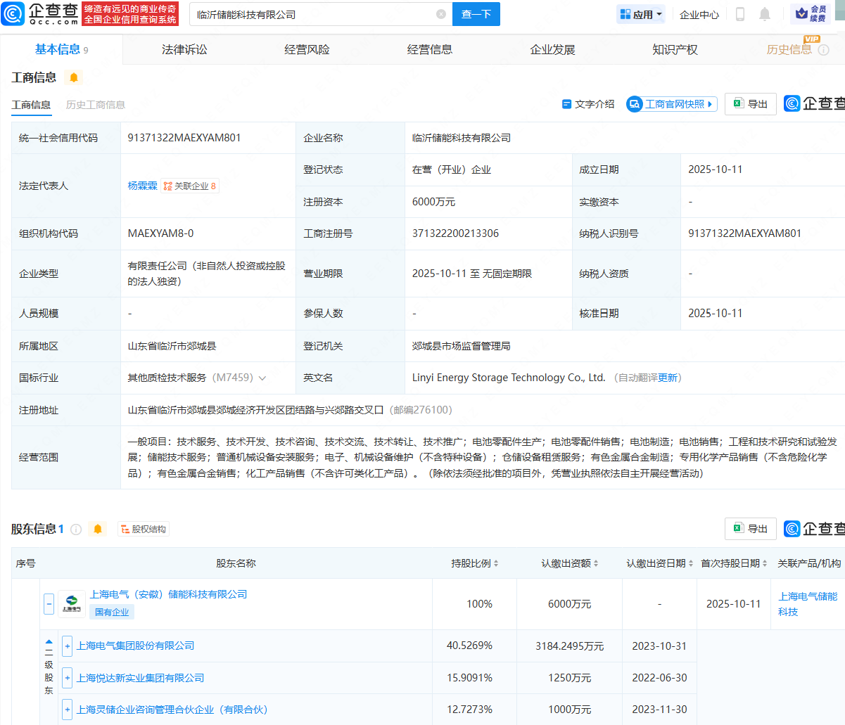 企查查APP显示,近日,临沂储能科技有限公司成立,法定代表人为杨霖霖,注册资本为6000万元,经营范围包含:电池零配件生产;电池零配件销售;电池制造;电池销售;工程和技术研究和试验发展;储能技术服务等。企查查股权穿透显示,该公司由上海电气(安徽)储能科技有限公司全资持股,后者由上海电气(601727)、上海悦达新实业集团有限公司等共同持股。