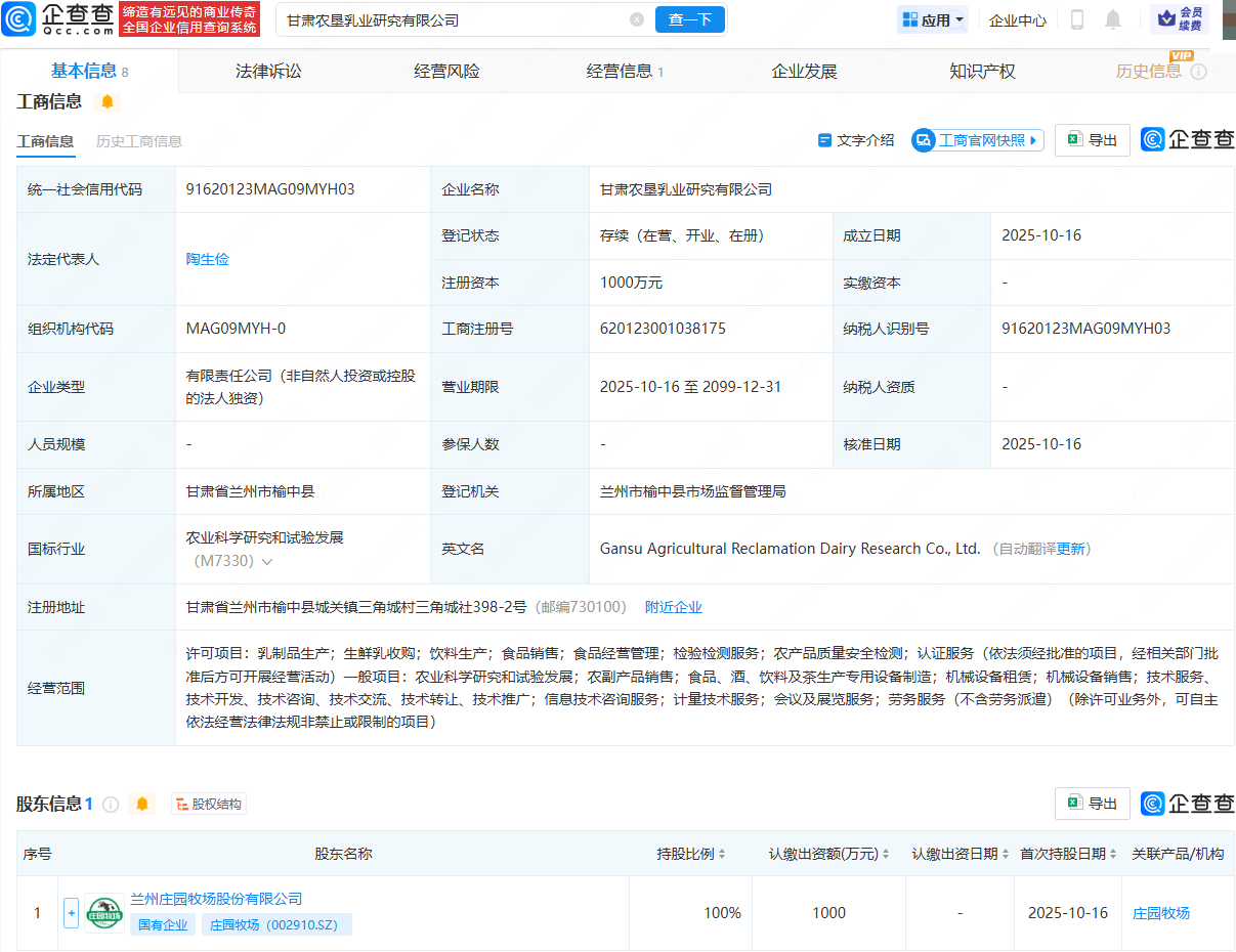 企查查APP显示,近日,甘肃农垦乳业研究有限公司成立,法定代表人为陶生俭,注册资本为1000万元,经营范围包含:乳制品生产;生鲜乳收购;饮料生产;食品销售;食品经营管理;检验检测服务等。企查查股权穿透显示,该公司由庄园牧场(002910)全资持股。