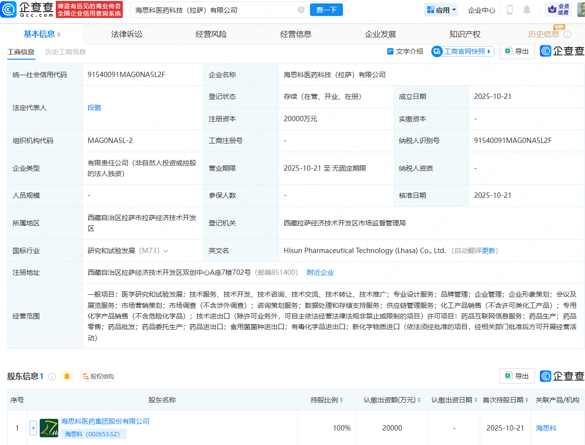 企查查APP显示,近日,海思科医药科技(拉萨)有限公司成立,法定代表人为段鹏,注册资本为2亿元,经营范围包含:专业设计服务;品牌管理;企业管理;药品互联网信息服务;药品生产;药品零售;药品批发等。企查查股权穿透显示,该公司由海思科(002653)全资持股。