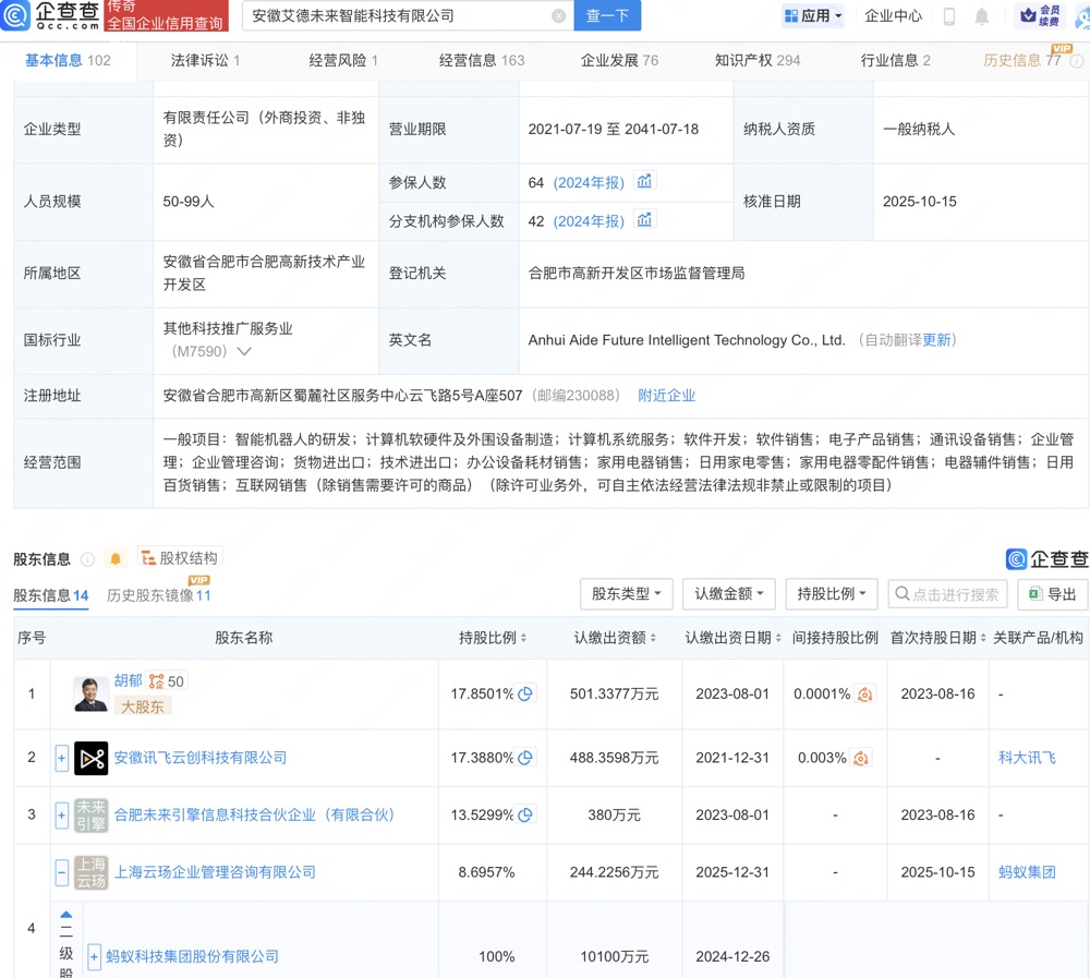 企查查APP显示,近日,安徽艾德未来智能科技有限公司发生工商变更,新增蚂蚁科技集团股份有限公司全资子公司上海云玚企业管理咨询有限公司为股东。企查查信息显示,该公司成立于2021年,法定代表人为马啸,经营范围包含:智能机器人的研发;计算机软硬件及外围设备制造;计算机系统服务等。公开信息显示,未来智能是一家深耕智能办公领域的AI科技硬件公司。