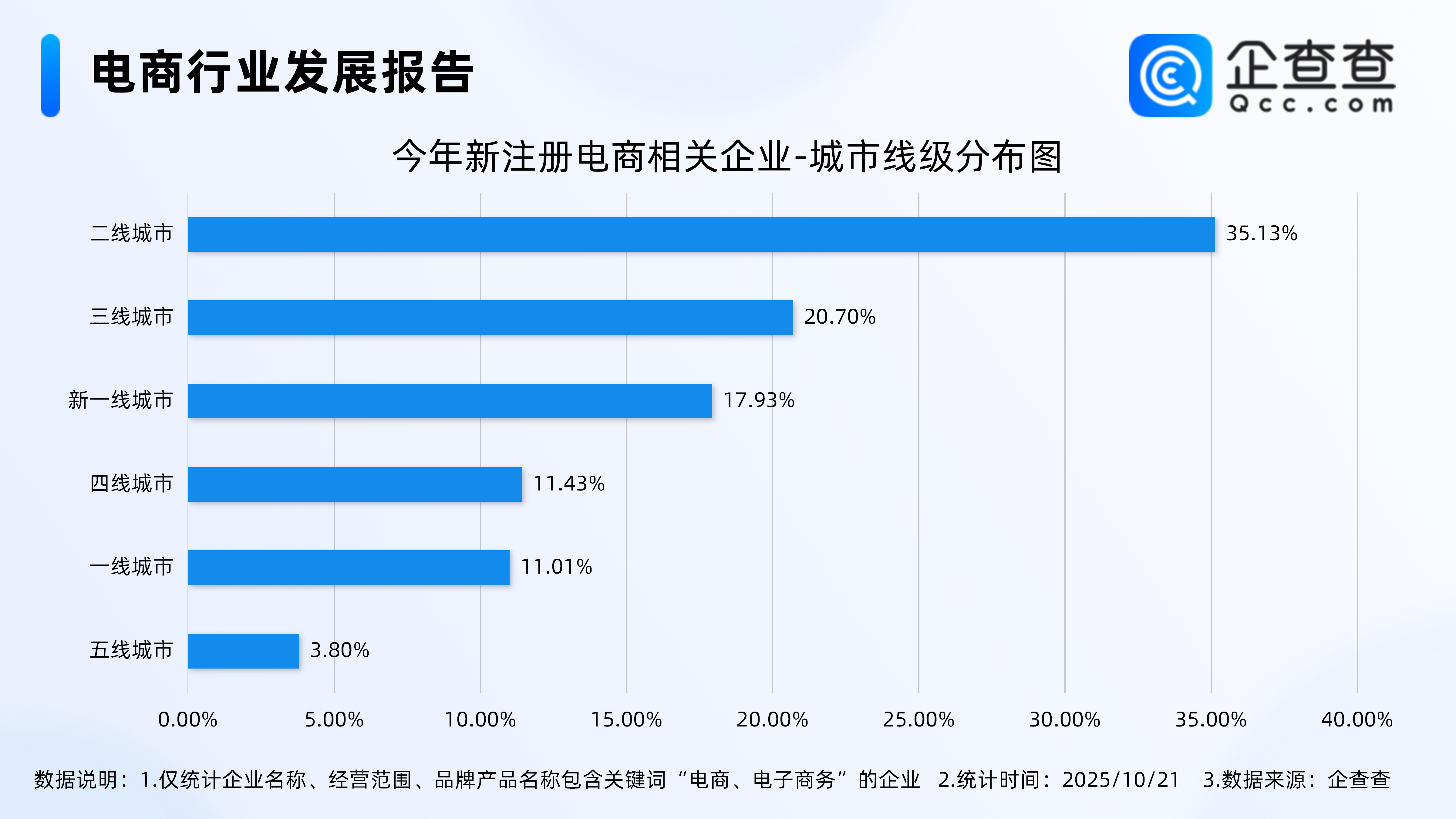 企查查数据显示,从城市线级分布来看,今年新注册的电商相关企业多集中在二线城市,占比35.13%。其次,三线城市、新一线城市的相关企业注册贡献率分别为20.70%、17.93%。
