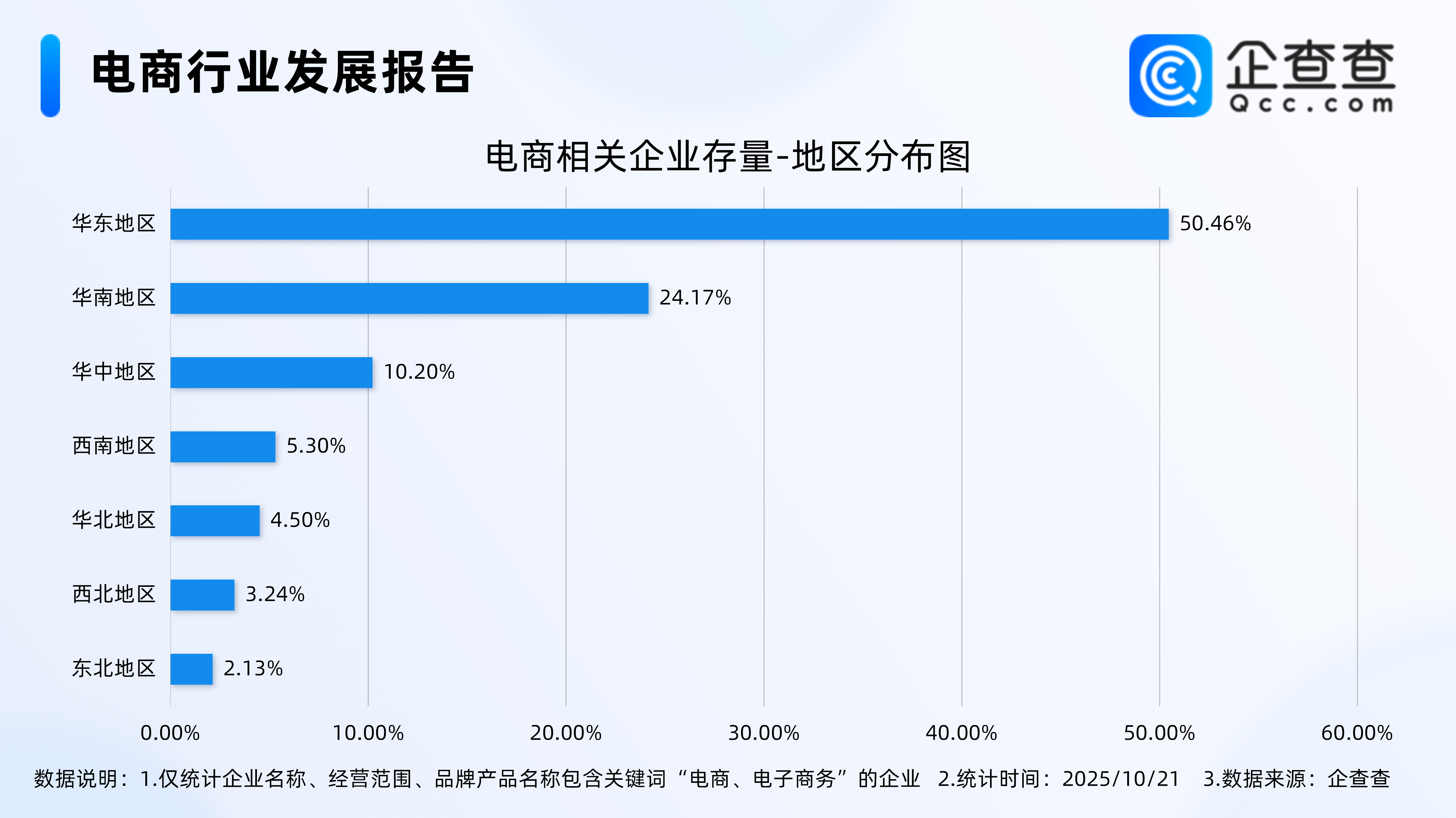 企查查数据显示,从地区分布来看,电商相关现存企业具有高度地域集中性,主要分布在华东地区,占比过半,达50.46%。其次,分布在华南地区、华中地区的相关企业分别占比24.17%、10.20%。其余地区分布占比均不足10%。