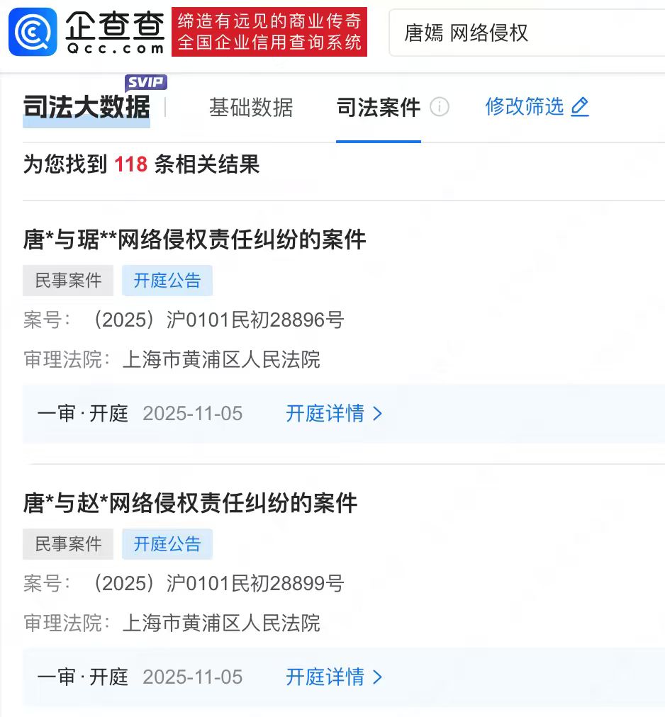 企查查APP显示,近日,法院公开@唐嫣 与琚某某、赵某网络侵权责任纠纷开庭信息,计划将于11月5日在上海市黄浦区人民法院审理。此前,“制片人曝唐嫣迟到一个月未进组”引发热议,唐嫣方发布律师声明否认,并于6月16日发布告黑维权进度公告。