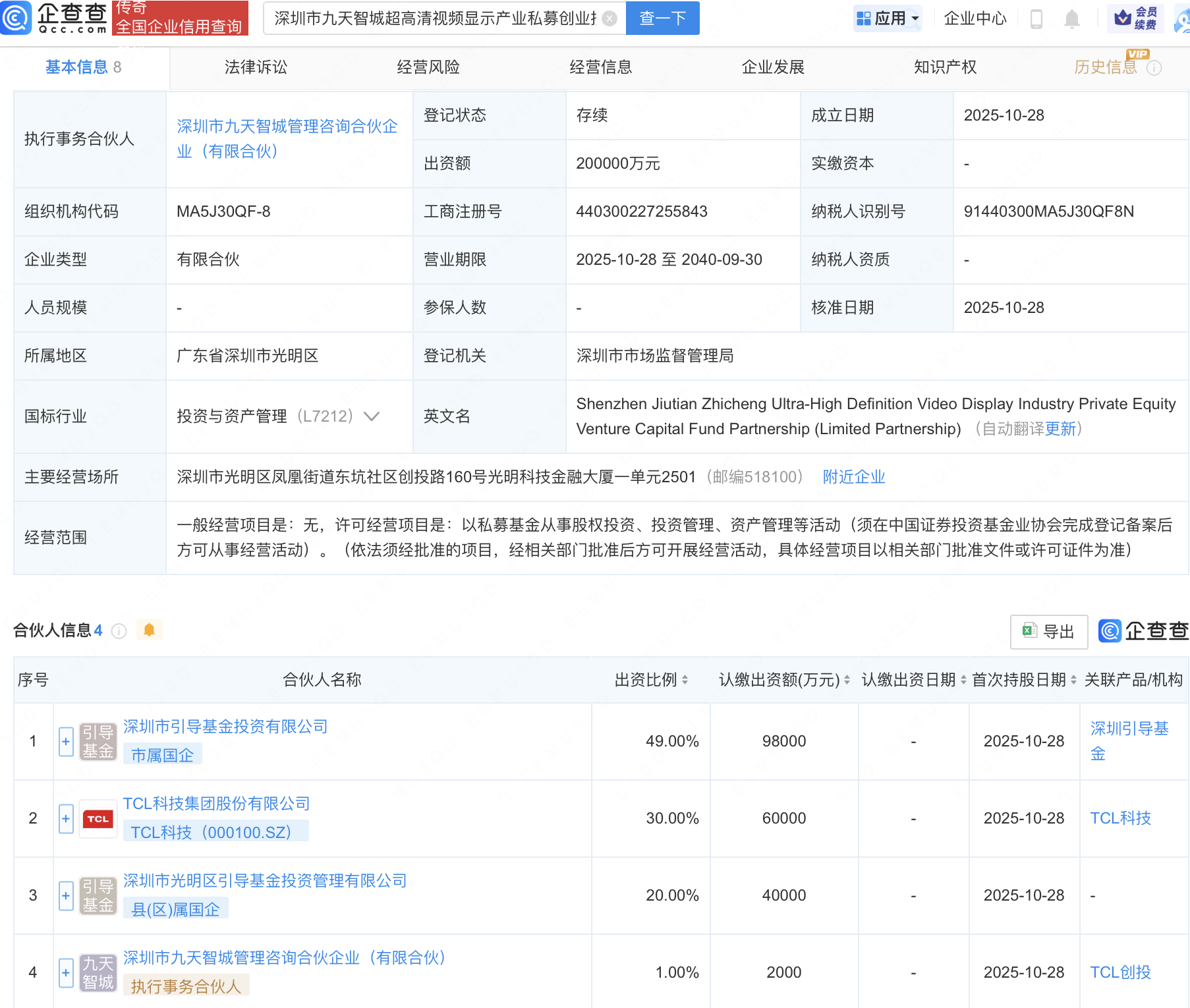企查查APP显示,近日,深圳市九天智城超高清视频显示产业私募创业投资基金合伙企业(有限合伙)成立,出资额20亿元,经营范围包含:以私募基金从事股权投资、投资管理、资产管理等活动。企查查股权穿透显示,该企业由TCL科技(000100)、深圳市引导基金投资有限公司等共同出资。