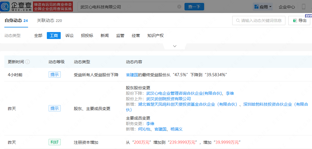 企查查APP显示,近日,武汉心电科技有限公司发生工商变更,注册资本增加到约240万元,新增湖北省楚天凤鸣科创天使投资基金合伙企业(有限合伙)、深圳哈勃科技投资合伙企业(有限合伙)为股东,同时,公司主要人员亦发生变更。