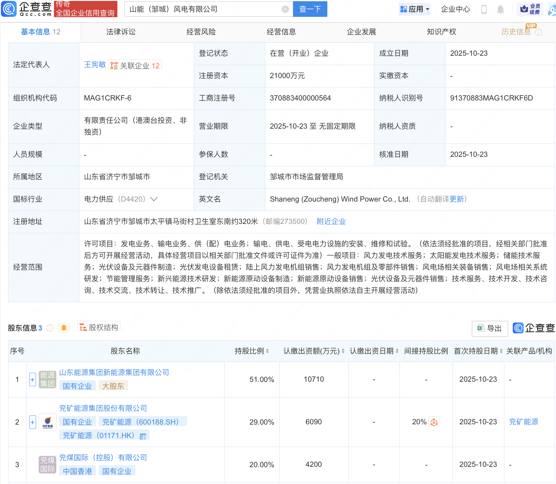 企查查APP显示,近日,山能(邹城)风电有限公司成立,注册资本2.1亿元,经营范围包含:风力发电技术服务;太阳能发电技术服务;储能技术服务;光伏设备及元器件制造等。企查查股权穿透显示,该公司由兖矿能源(600188)等共同持股。