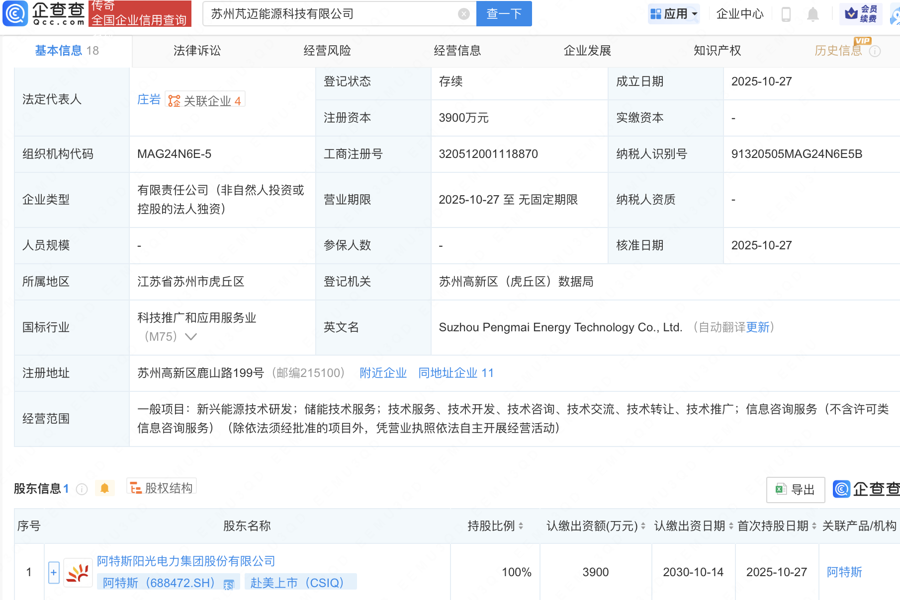企查查APP显示,近日,苏州芃迈能源科技有限公司成立,注册资本3900万元,经营范围包含:新兴能源技术研发;储能技术服务等。企查查股权穿透显示,该公司由阿特斯(688472)全资持股。