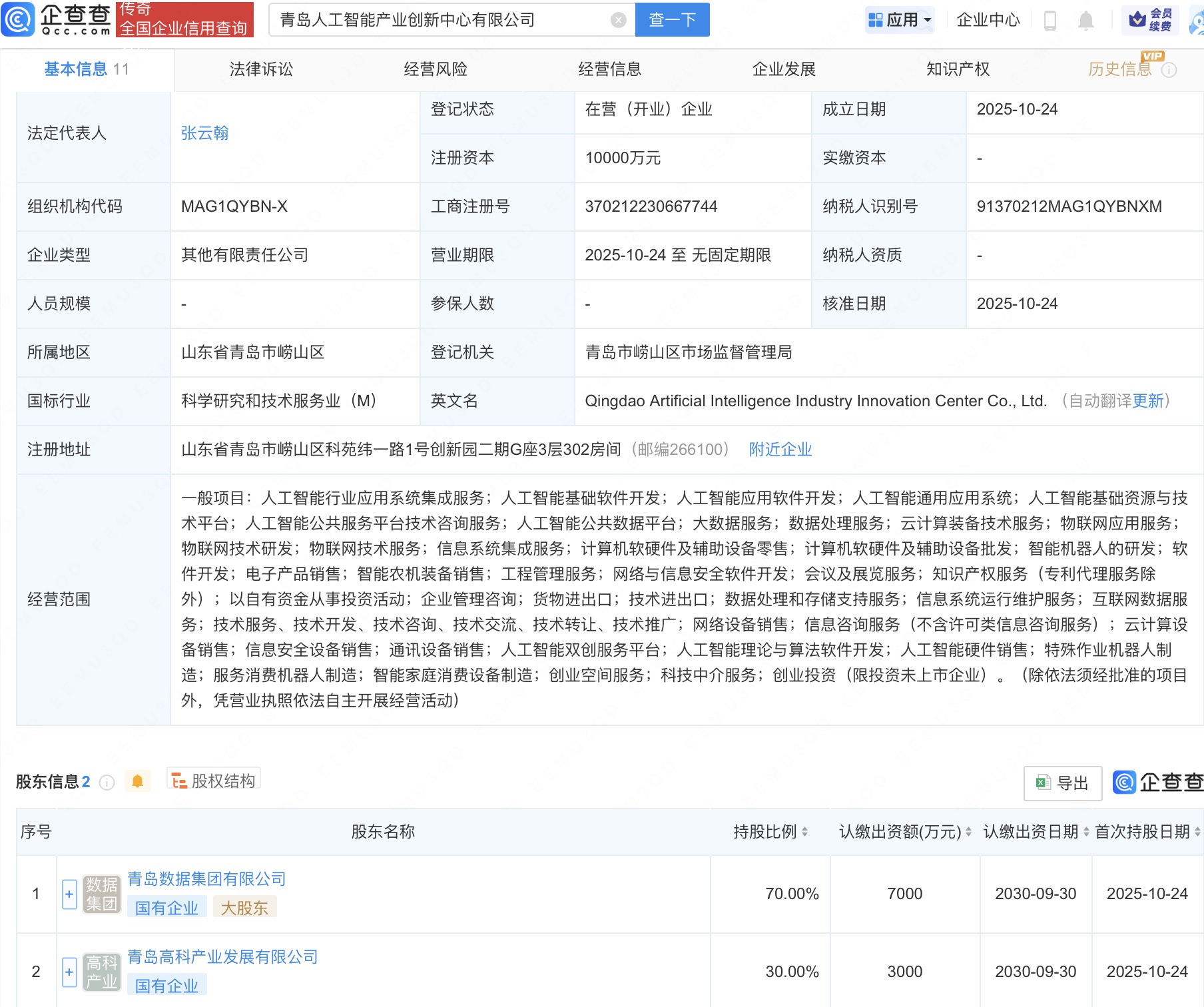 企查查APP显示,近日,青岛人工智能产业创新中心有限公司成立,法定代表人为张云翰,注册资本1亿人民币,经营范围包括人工智能行业应用系统集成服务、人工智能基础软件开发、人工智能应用软件开发、人工智能通用应用系统等。企查查股权穿透显示,该公司由青岛数据集团有限公司、青岛高科产业发展有限公司共同持股。