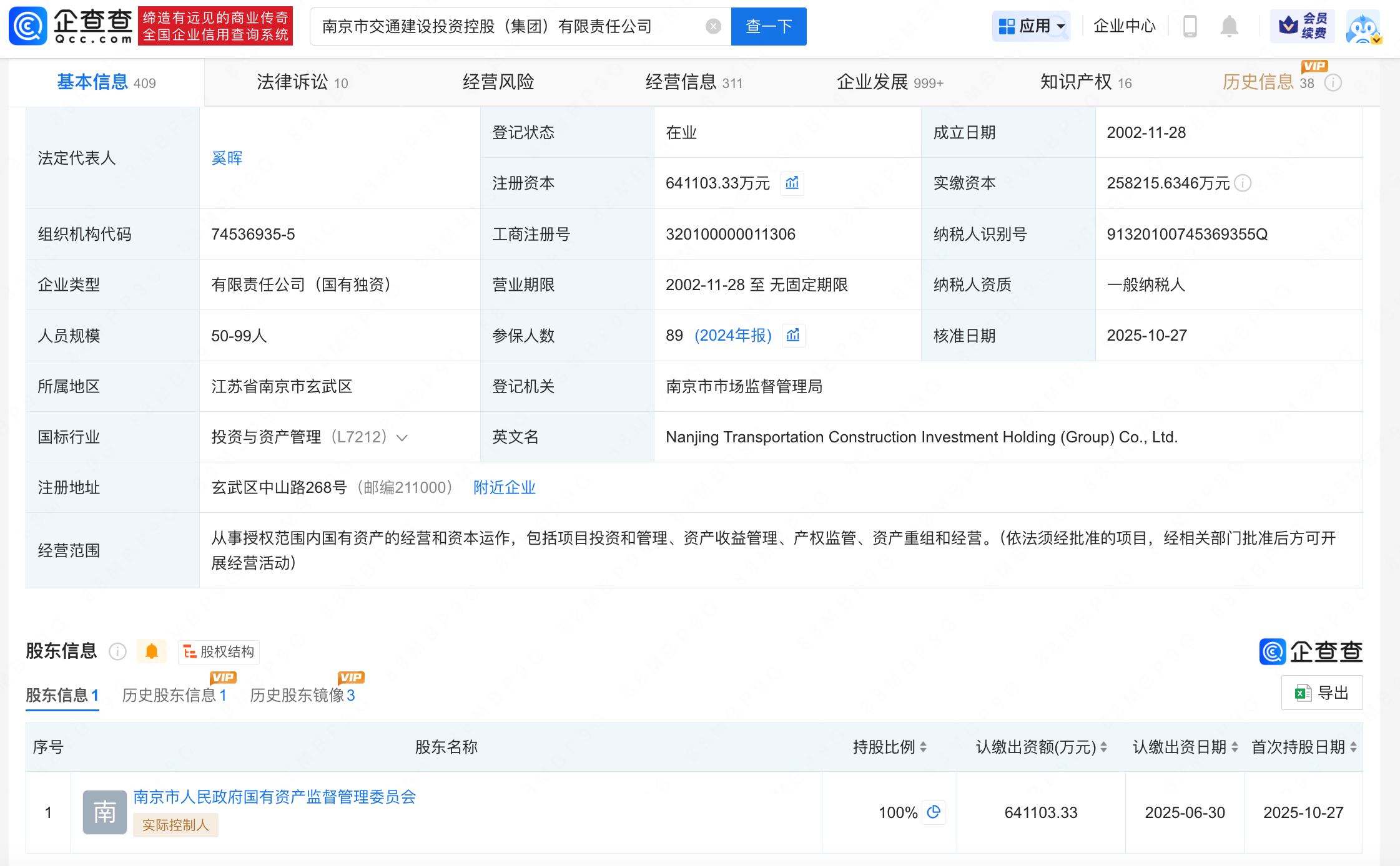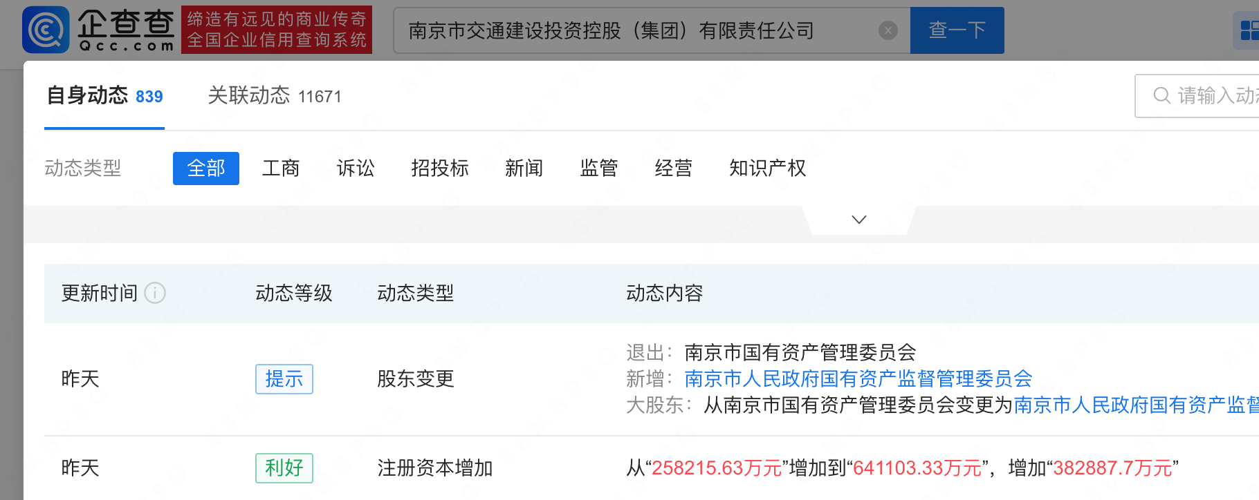 企查查APP显示,近日,南京市交通建设投资控股(集团)有限责任公司发生工商变更,注册资本由约25.8亿人民币增至约64.1亿人民币,增幅约148%。企查查信息显示,该公司成立于2002年11月,法定代表人为奚晖,经营范围为从事授权范围内国有资产的经营和资本运作,包括项目投资和管理、资产收益管理、产权监管、资产重组和经营,由南京市人民政府国有资产监督管理委员会全资持股。