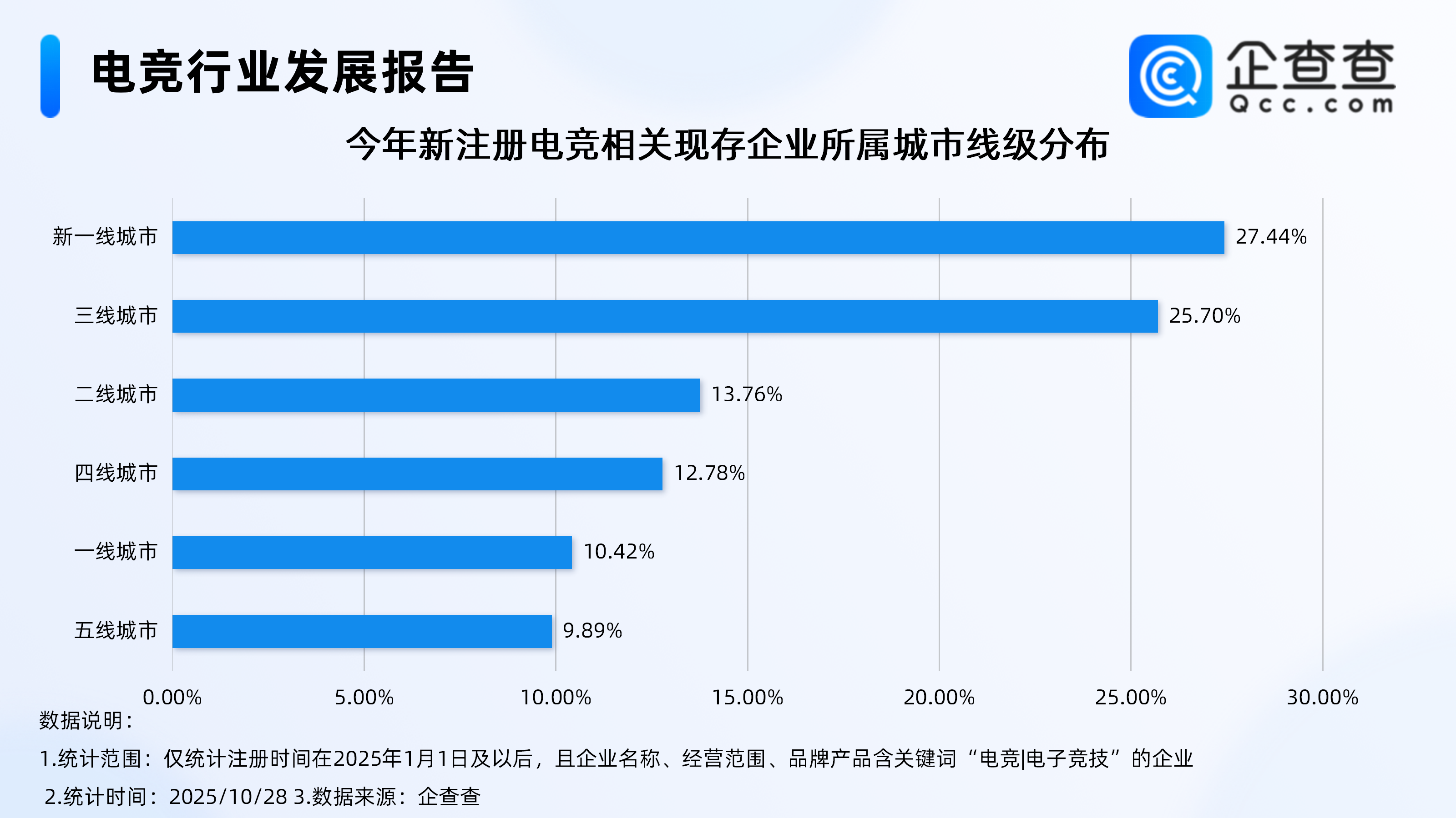 企查查数据显示,从城市线级分布来看,今年新注册的电竞相关企业多分布在新一线城市及三线城市,分别占比27.44%、25.7%。