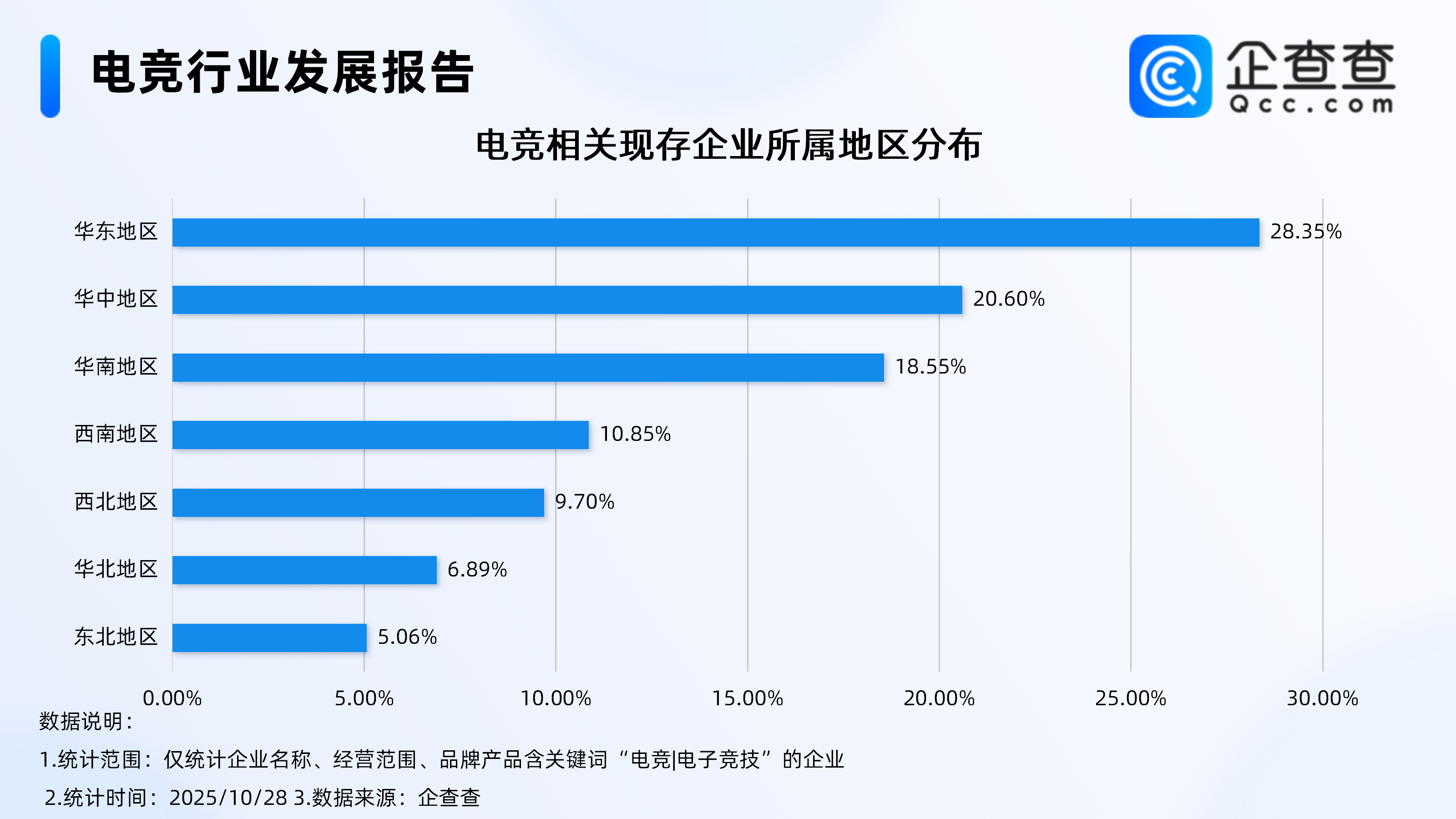 企查查数据显示,截至10月下旬,国内电竞相关现存企业达13.83万家,主要分布在华东、华中地区,分别占比28.35%、20.6%。分布在华南地区、西南地区的相关企业,占比均在10%-20%之间。