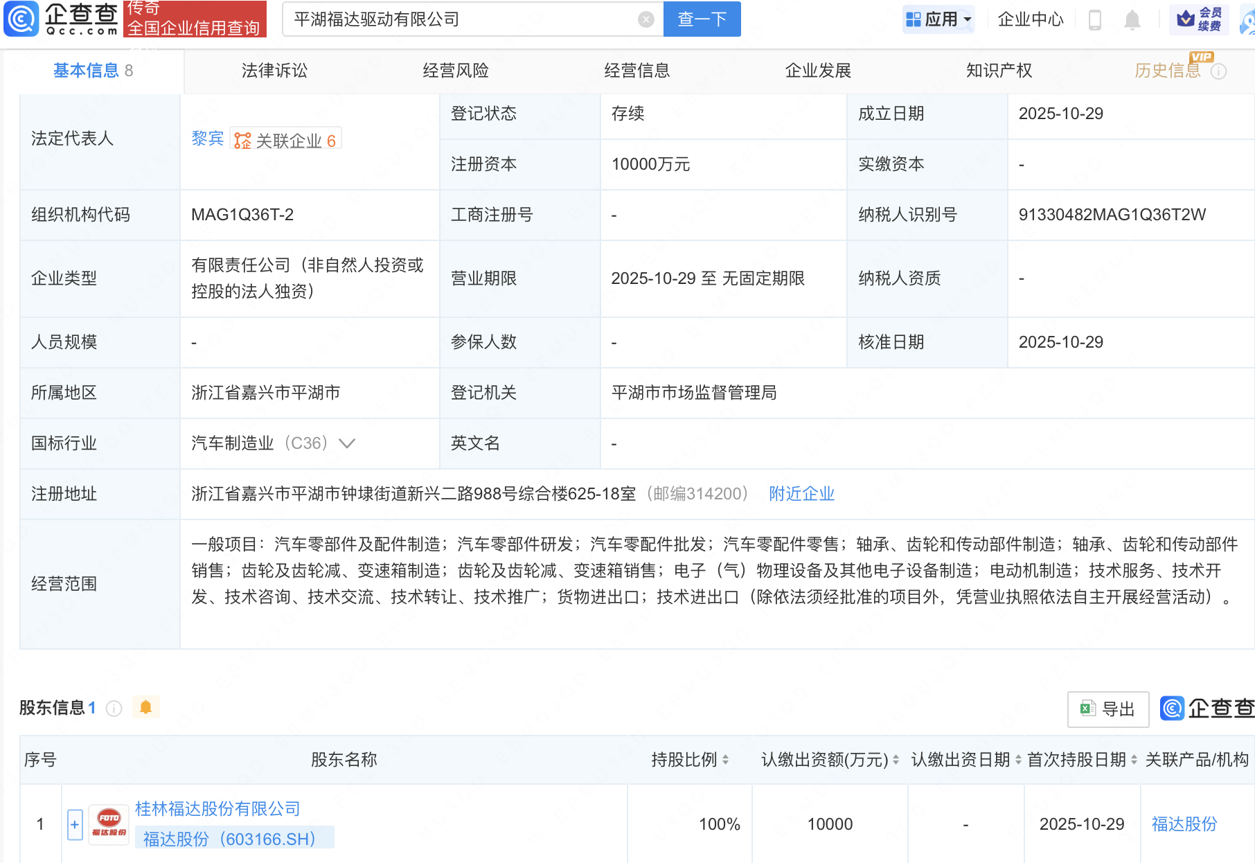 企查查APP显示,近日,平湖福达驱动有限公司成立,注册资本1亿元,经营范围包含:汽车零部件及配件制造;汽车零部件研发;汽车零配件批发;汽车零配件零售等。企查查股权穿透显示,该公司由福达股份(603166)全资持股。