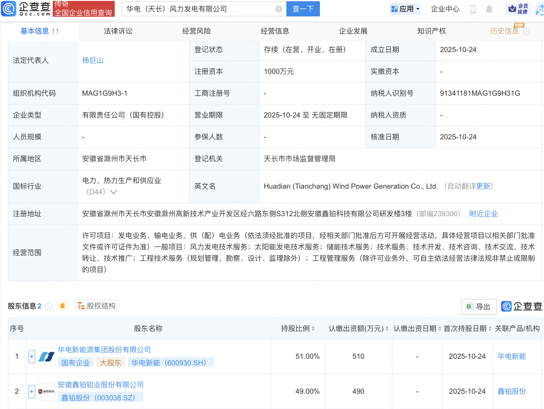 企查查APP显示,近日,华电(天长)风力发电有限公司成立,注册资本1000万元,经营范围包含:风力发电技术服务;太阳能发电技术服务;储能技术服务等。企查查股权穿透显示,该公司由华电新能(600930)、鑫铂股份(003038)共同持股。