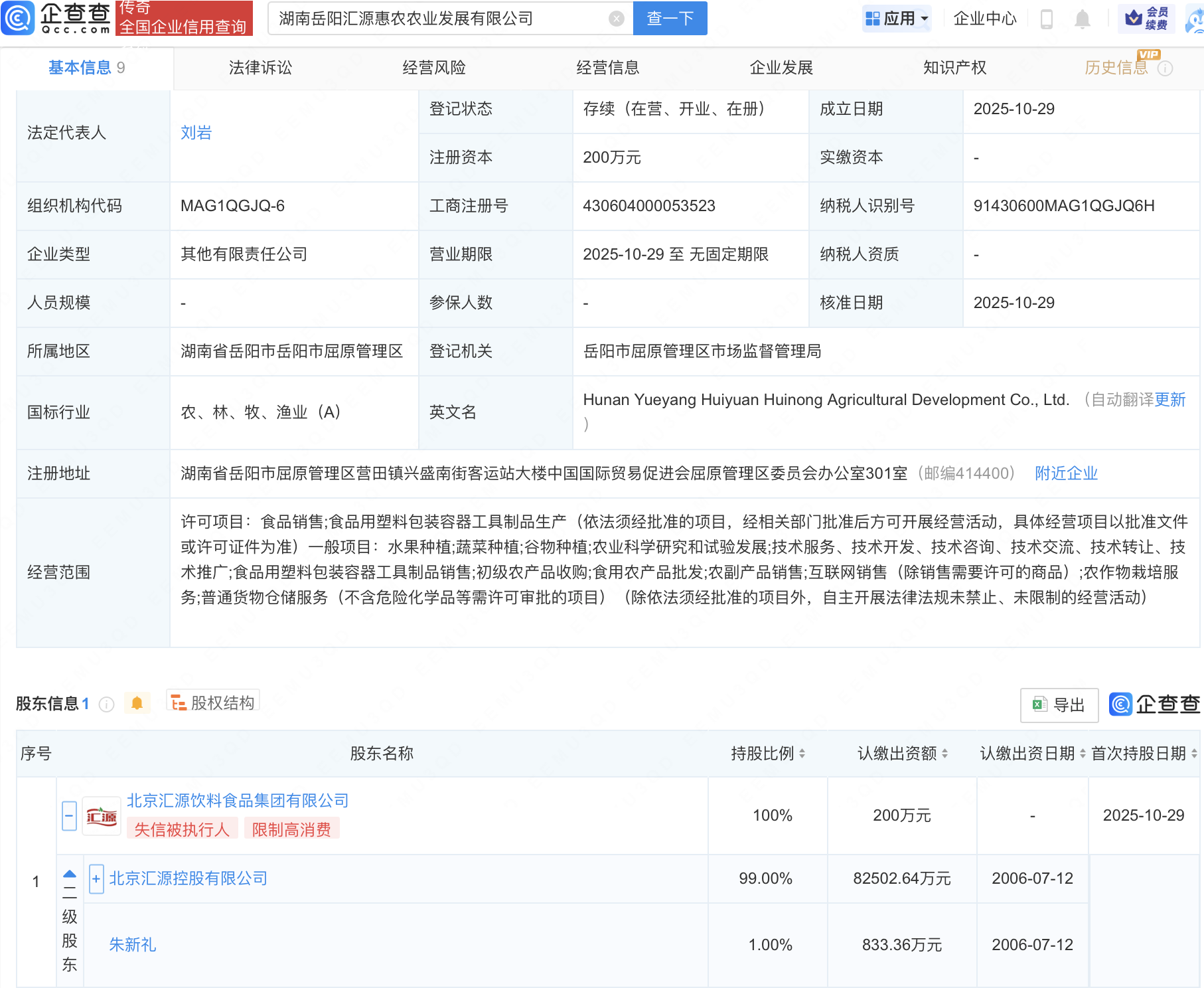企查查APP显示,近日,湖南岳阳汇源惠农农业发展有限公司成立,经营范围包含:水果种植;蔬菜种植;谷物种植;农业科学研究和试验发展等。企查查股权穿透显示,该公司由北京汇源控股有限公司旗下北京汇源饮料食品集团有限公司全资持股。
