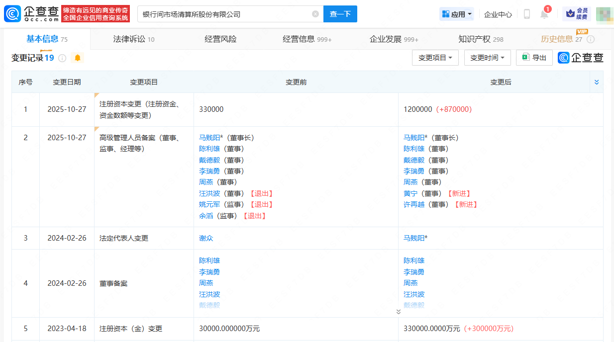企查查APP显示,近日,上海清算所关联公司即银行间市场清算所股份有限公司发生工商变更,注册资本由33亿人民币增至120亿人民币,同时多位高管发生变更。企查查信息显示,该公司成立于2009年11月,法定代表人为马贱阳,经营范围涉及为金融市场提供直接和间接的本外币清算服务等,由中国外汇交易中心(全国银行间同业拆借中心)、中央国债登记结算有限责任公司、中国金币集团有限公司等共同持股。