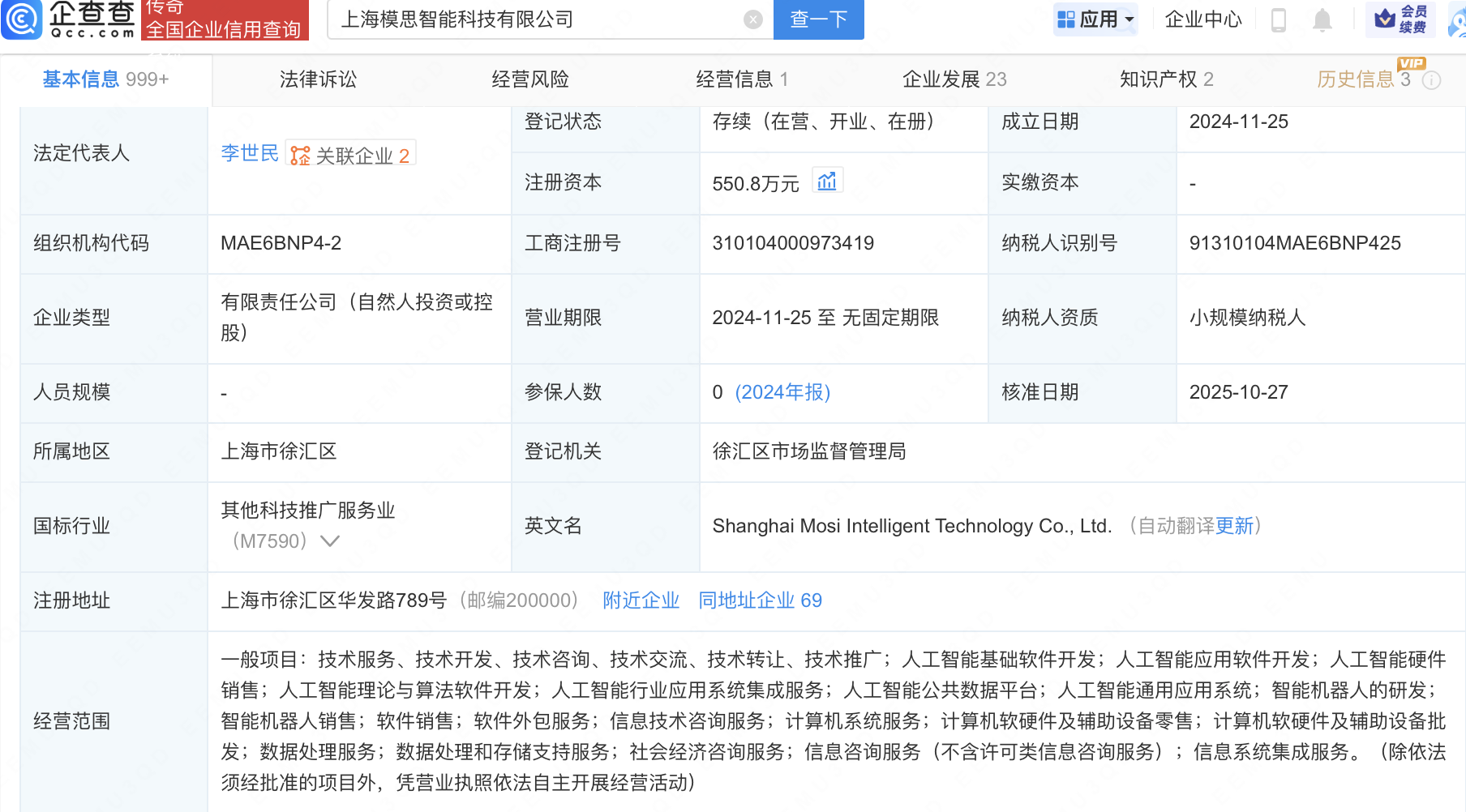 企查查APP显示,近日,上海模思智能科技有限公司发生工商变更,新增深圳哈勃科技投资合伙企业(有限合伙)等为股东,同时注册资本增至550.8万元。企查查信息显示,该公司成立于2024年,法定代表人为李世民,经营范围包含:人工智能公共数据平台;人工智能通用应用系统;智能机器人的研发;智能机器人销售等。公开信息显示,模思智能是一家人工智能企业,专注于情景智能领域,研发语音大模型和强交互多模态大模型。