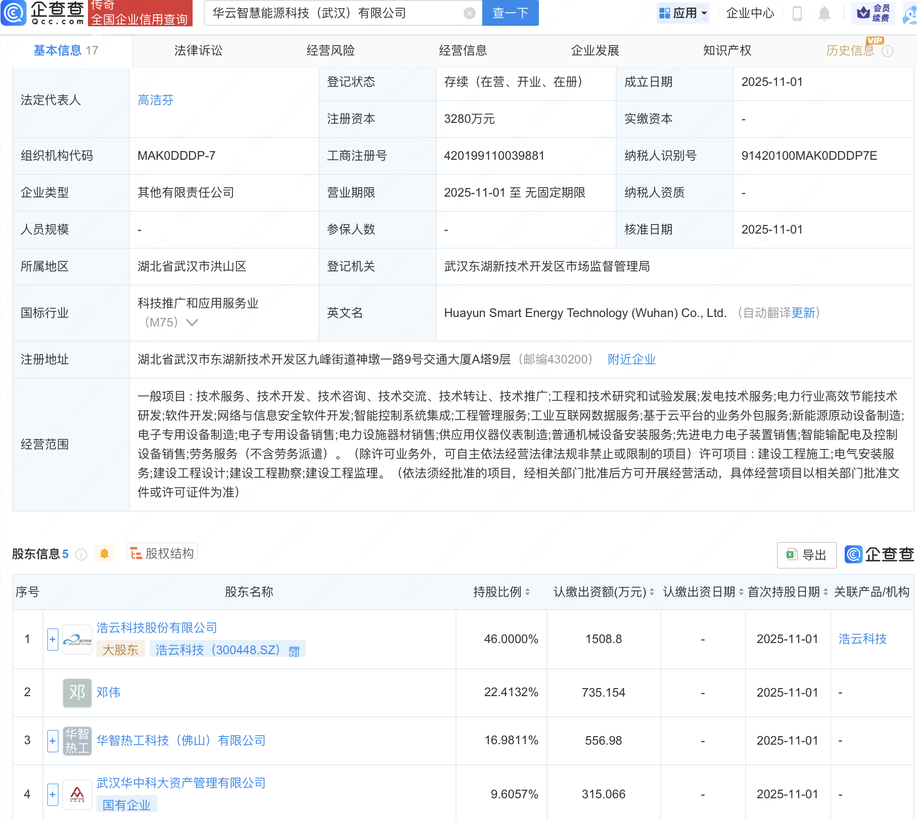企查查APP显示,近日,华云智慧能源科技(武汉)有限公司成立,经营范围包含:新能源原动设备制造;电子专用设备制造;电力设施器材销售等。企查查股权穿透显示,该公司由浩云科技(300448)等共同持股。