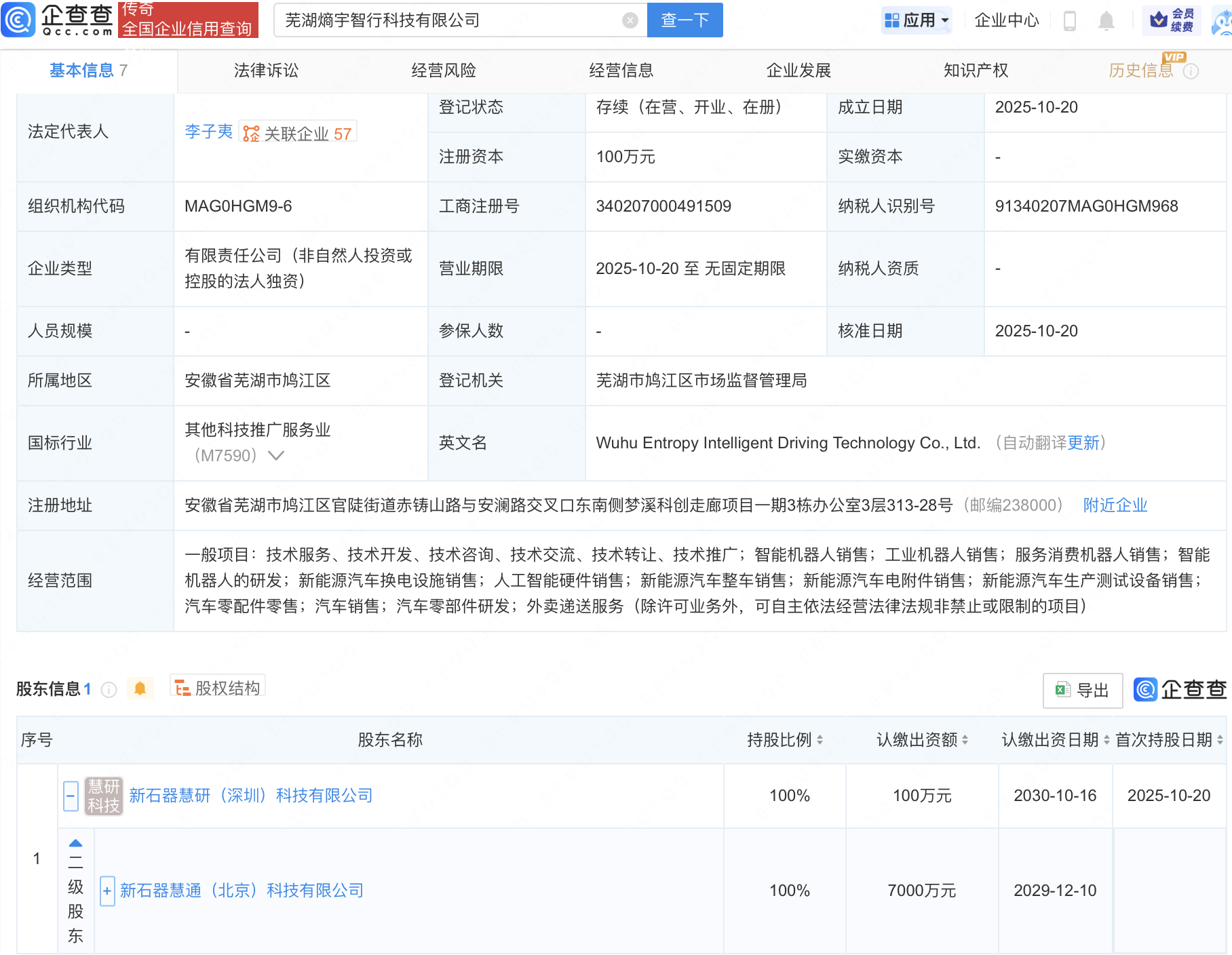企查查APP显示,近日,芜湖熵宇智行科技有限公司成立,法定代表人为李子夷,经营范围包含:智能机器人销售;工业机器人销售;服务消费机器人销售;智能机器人的研发;人工智能硬件销售等。企查查股权穿透显示,该公司由新石器慧通(北京)科技有限公司间接全资持股。