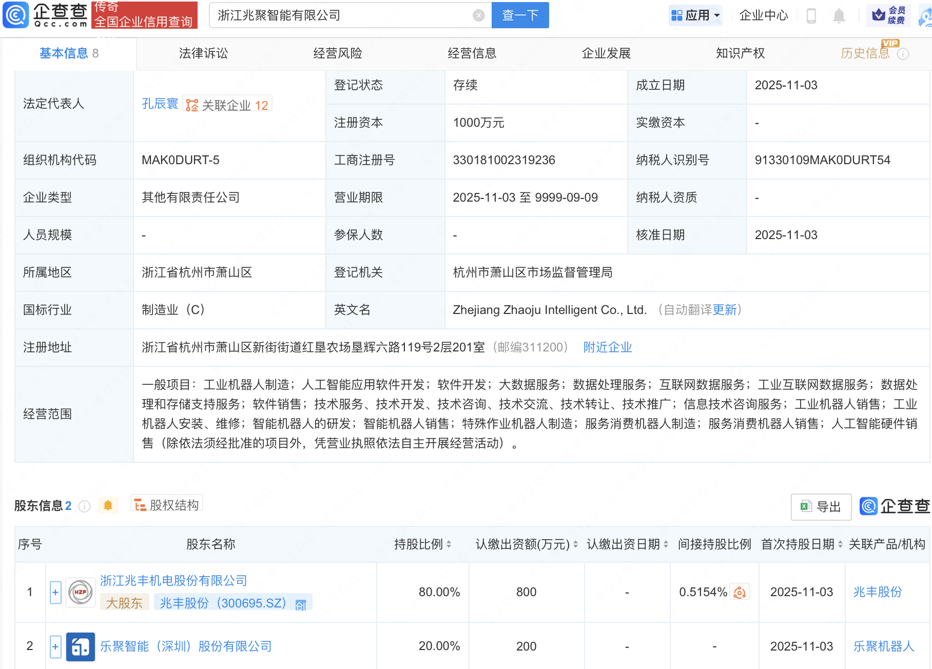 企查查APP显示,近日,浙江兆聚智能有限公司成立,注册资本1000万元,经营范围包含:人工智能应用软件开发;智能机器人的研发;智能机器人销售;人工智能硬件销售等。企查查股权穿透显示,该公司由兆丰股份(300695)、乐聚机器人关联公司乐聚智能(深圳)股份有限公司共同持股。
