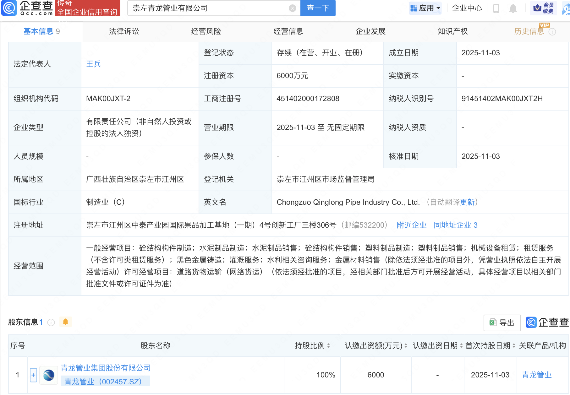 企查查APP显示,近日,崇左青龙管业有限公司成立,注册资本6000万元,经营范围包含:黑色金属铸造;灌溉服务;水利相关咨询服务;金属材料销售等。企查查股权穿透显示,该公司由青龙管业(002457)全资持股。