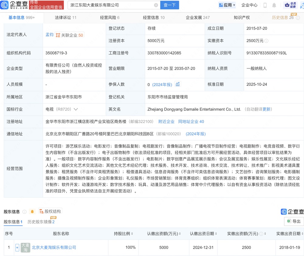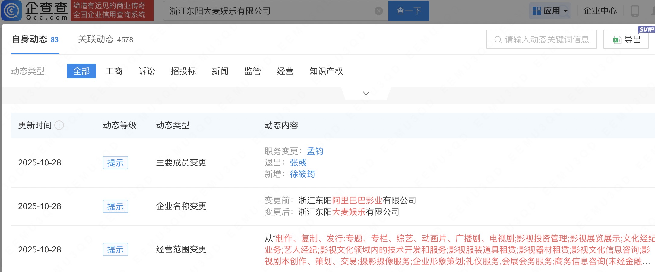 企查查APP显示,近日,浙江东阳阿里巴巴影业有限公司发生工商变更,企业名称变更为浙江东阳大麦娱乐有限公司,同时经营范围及部分高管也发生变更。企查查信息显示,该公司成立于2015年,法定代表人为孟钧,注册资本5000万人民币,经营范围包括游艺娱乐活动、电影发行、音像制品复制、电视剧发行等,由北京大麦淘娱乐有限公司全资持股。