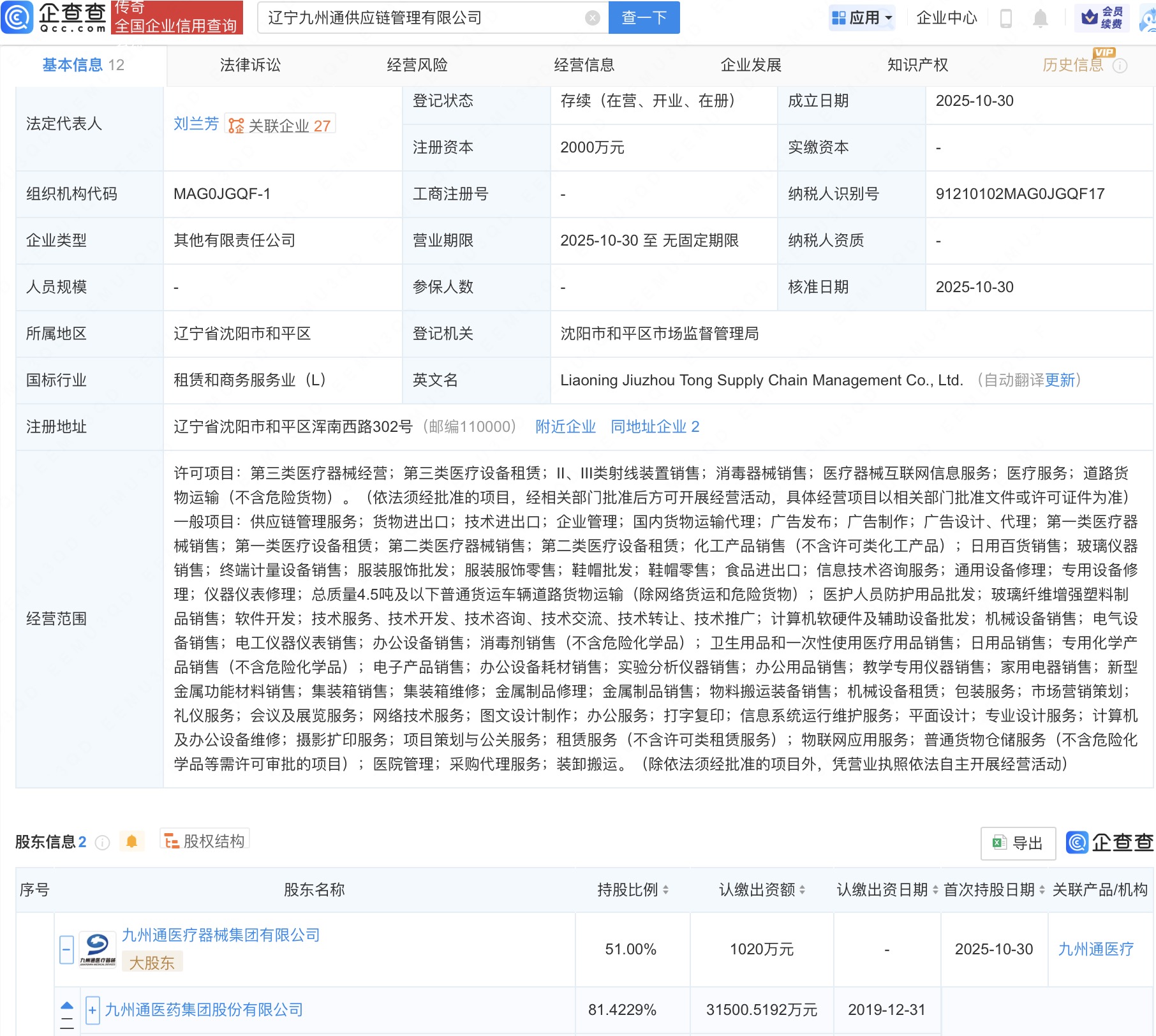 企查查APP显示,近日,辽宁九州通供应链管理有限公司成立,法定代表人为刘兰芳,注册资本2000万人民币,经营范围包括供应链管理服务、货物进出口、第三类医疗器械经营等。企查查股权穿透显示,该公司由九州通(600998)旗下九州通医疗器械集团有限公司等共同持股。