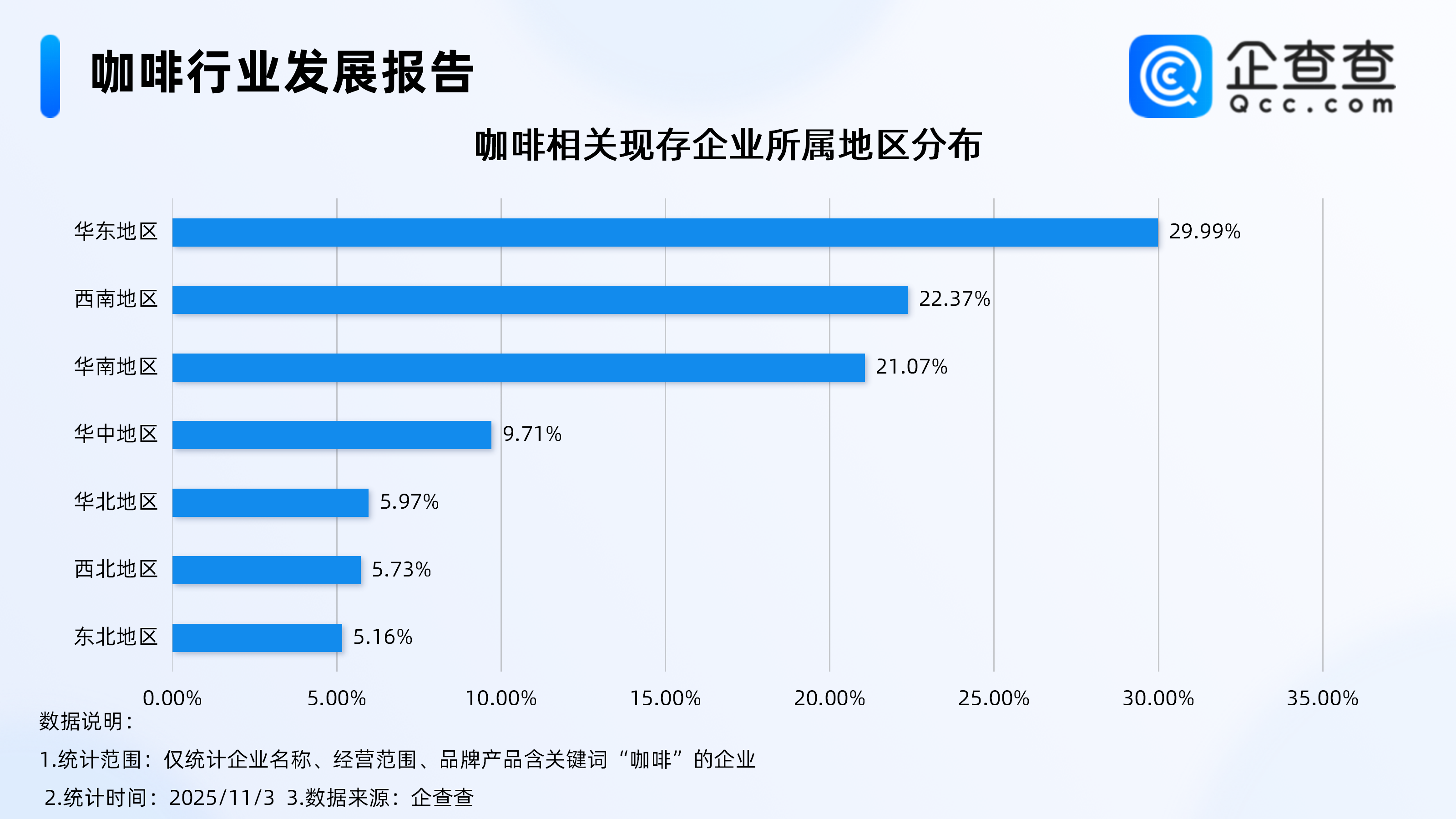 企查查数据显示,截至11月初,国内咖啡相关企业现存量达25.76万家,主要分布在华东、西南和华南地区,其中位于华东地区的相关企业最多,占比达29.99%,位于西南地区、华南地区的相关企业,分别占比22.37%、21.07%。