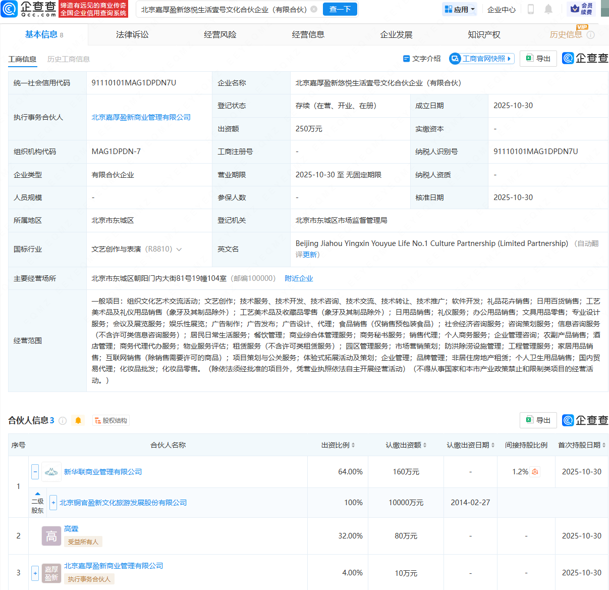 企查查APP显示,近日,北京嘉厚盈新悠悦生活壹号文化合伙企业(有限合伙)成立,执行事务合伙人为北京嘉厚盈新商业管理有限公司,经营范围包含:组织文化艺术交流活动;文艺创作;咨询策划服务;商业综合体管理服务;商务秘书服务等。企查查股权穿透显示,该合伙企业由盈新发展(000620)全资子公司新华联商业管理有限公司等共同持股。