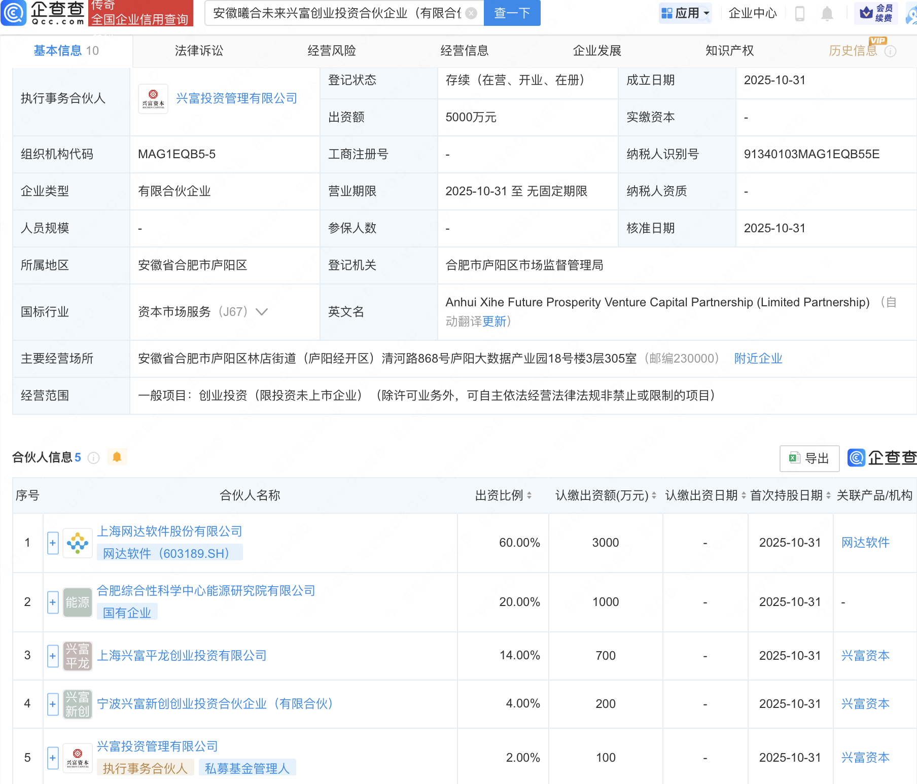 企查查APP显示,近日,安徽曦合未来兴富创业投资合伙企业(有限合伙)成立,出资额5000万元,经营范围包含:创业投资(限投资未上市企业)。企查查股权穿透显示,该企业由网达软件(603189)等共同出资。