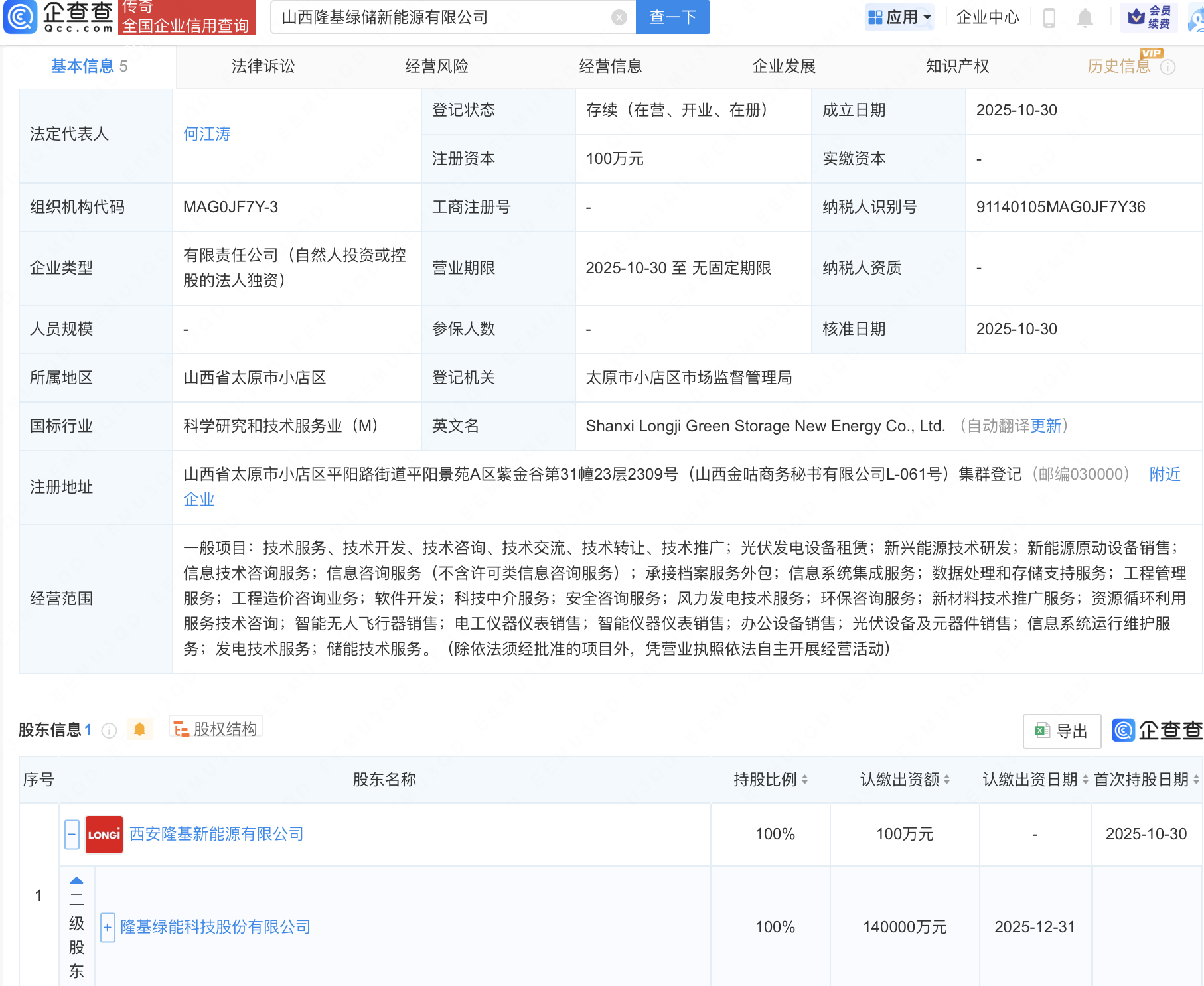 企查查APP显示,近日,山西隆基绿储新能源有限公司成立,经营范围包含:新兴能源技术研发;新能源原动设备销售;资源循环利用服务技术咨询;智能无人飞行器销售等。企查查股权穿透显示,该公司由隆基绿能(601012)间接全资持股。