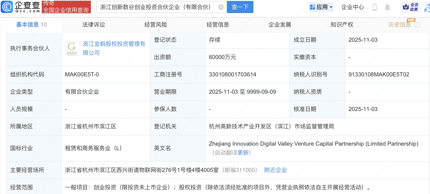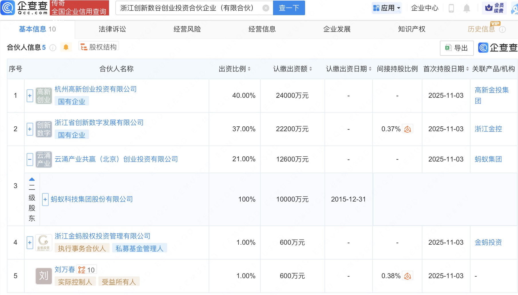 企查查APP显示,近日,浙江创新数谷创业投资合伙企业(有限合伙)成立,出资额6亿人民币,经营范围为创业投资、股权投资。企查查股权穿透显示,该企业由蚂蚁科技集团股份有限公司全资子公司云涌产业共赢(北京)创业投资有限公司等共同出资。