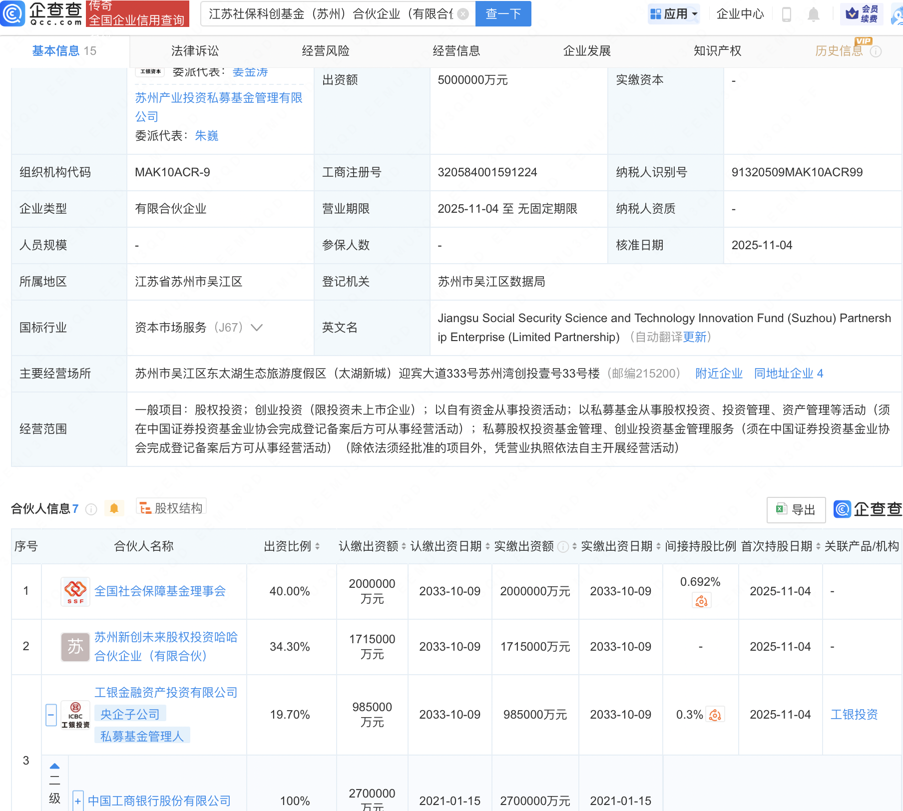 企查查APP显示,近日,江苏社保科创基金(苏州)合伙企业(有限合伙)成立,出资额500亿元,经营范围包含:股权投资;创业投资(限投资未上市企业);以自有资金从事投资活动;私募股权投资基金管理、创业投资基金管理服务等。企查查股权穿透显示,该企业由全国社会保障基金理事会、工商银行(601398)全资子公司工银金融资产投资有限公司等共同出资。