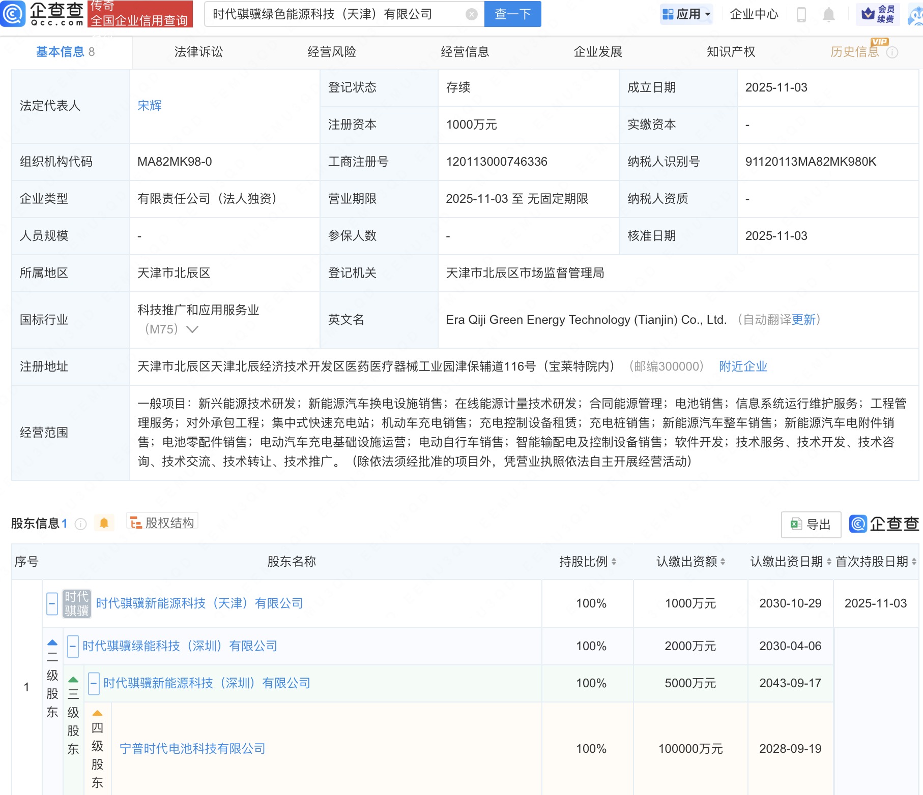 企查查APP显示,近日,时代骐骥绿色能源科技(天津)有限公司成立,法定代表人为宋辉,注册资本1000万人民币,经营范围包括新兴能源技术研发、新能源汽车换电设施销售、在线能源计量技术研发、合同能源管理等。企查查股权穿透显示,该公司由宁德时代(300750)旗下时代骐骥新能源科技(天津)有限公司全资持股。