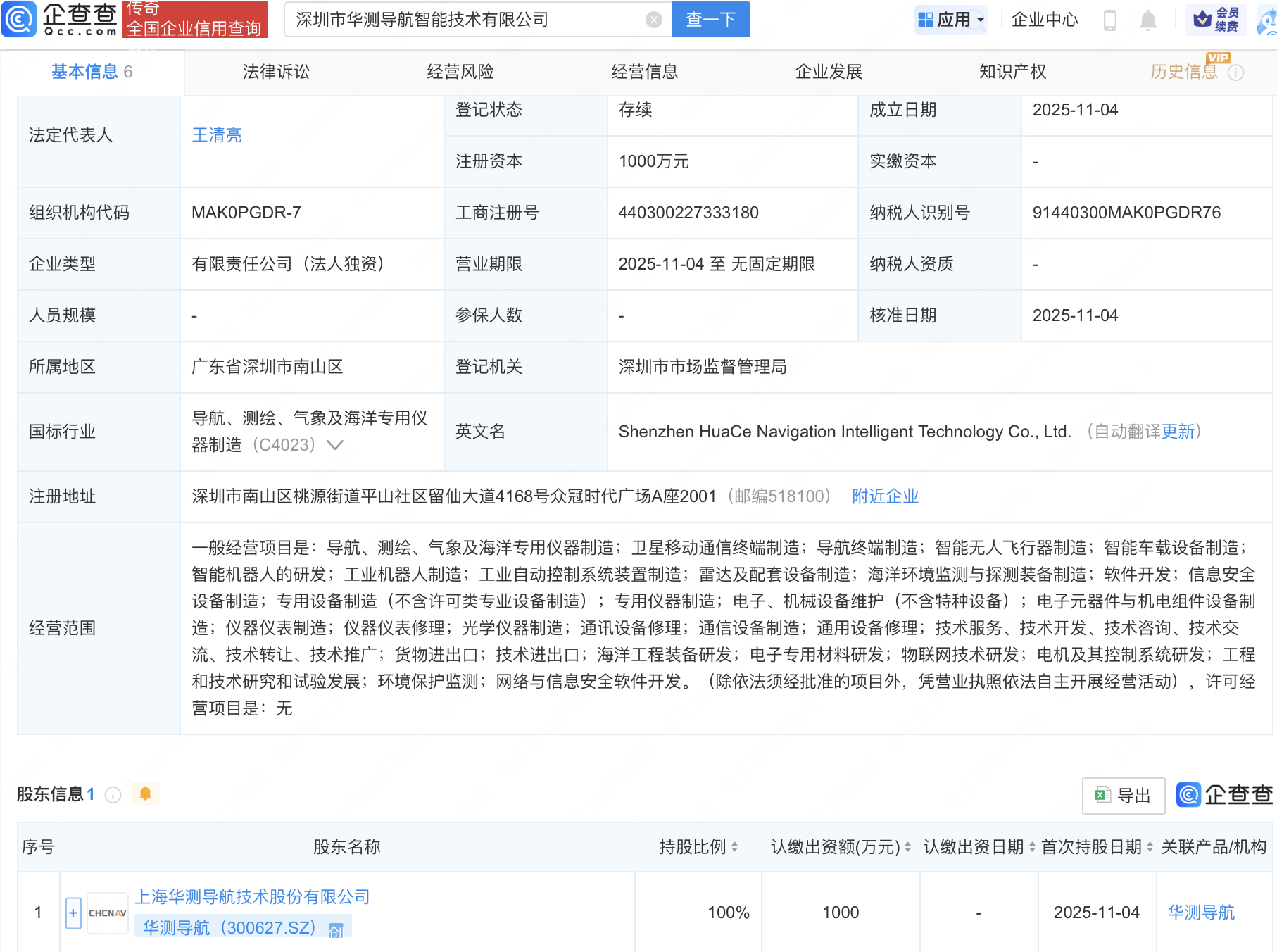 企查查APP显示,近日,深圳市华测导航智能技术有限公司成立,注册资本1000万元,经营范围包含:智能无人飞行器制造;智能车载设备制造;智能机器人的研发;工业机器人制造等。企查查股权穿透显示,该公司由华测导航(300627)全资持股。