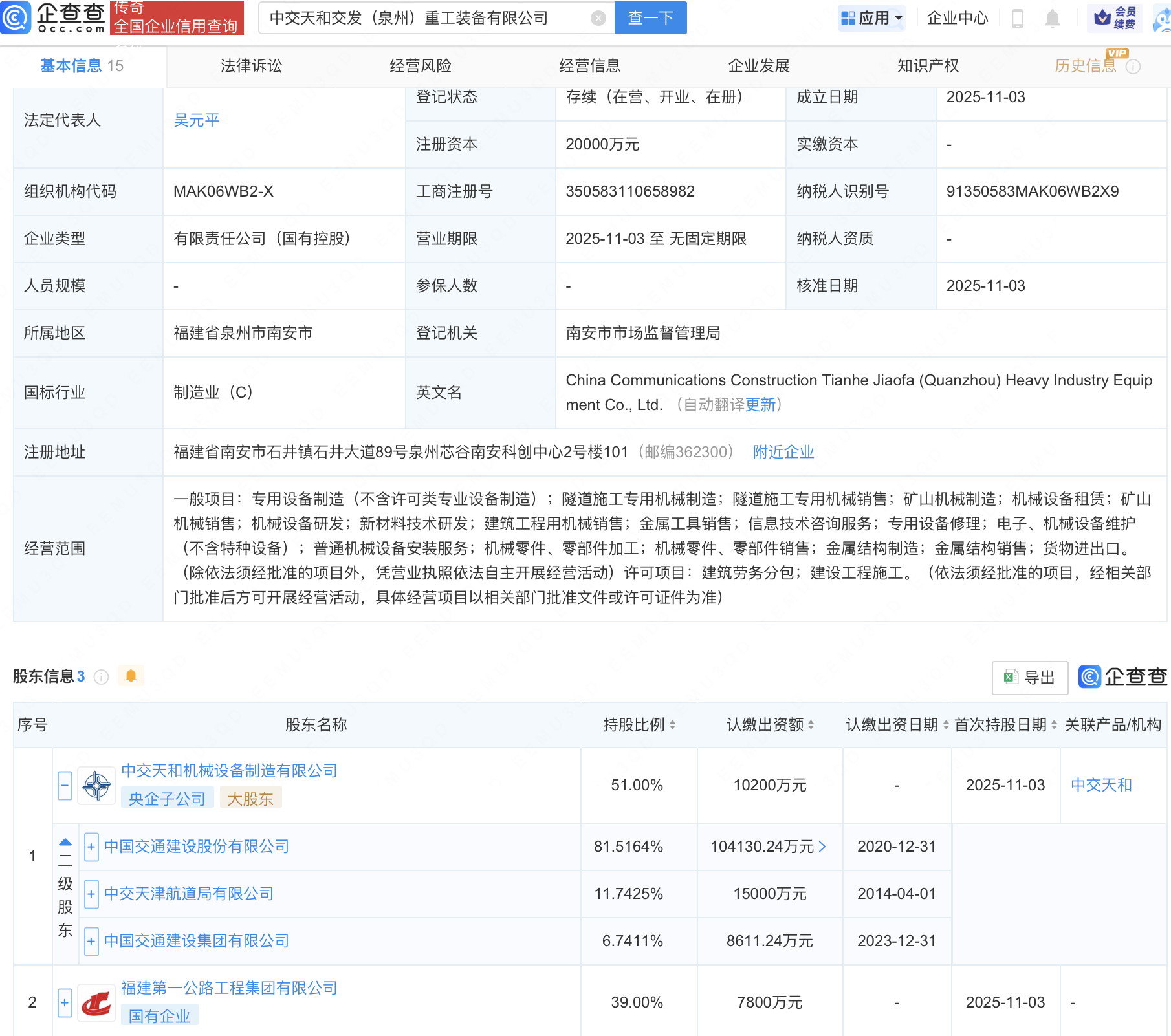 企查查APP显示,近日,中交天和交发(泉州)重工装备有限公司成立,注册资本2亿元,经营范围包含:隧道施工专用机械制造;隧道施工专用机械销售;矿山机械制造;机械设备租赁等。企查查股权穿透显示,该公司由中国交建(601800)旗下中交天和机械设备制造有限公司等共同持股。