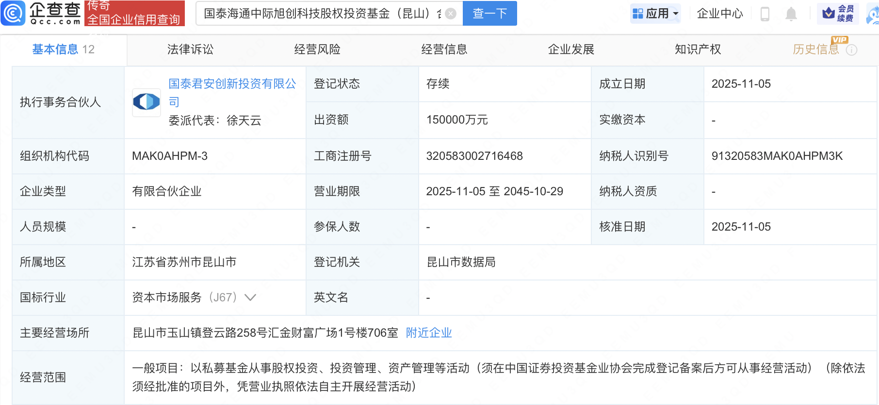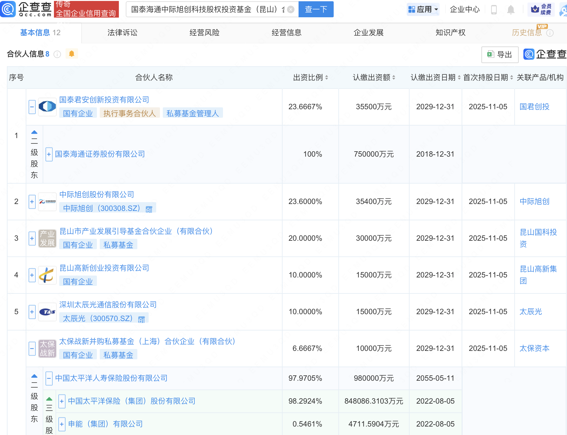 企查查APP显示,近日,国泰海通中际旭创科技股权投资基金(昆山)合伙企业(有限合伙)成立,出资额15亿元,经营范围包含:以私募基金从事股权投资、投资管理、资产管理等活动。企查查股权穿透显示,该企业由国泰海通(601211)旗下国泰君安创新投资有限公司、中际旭创(300308)、中国太保(601601)旗下太保战新并购私募基金(上海)合伙企业(有限合伙)、太辰光(300570)等共同出资。