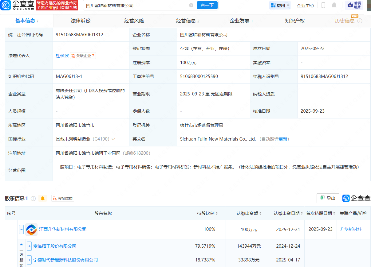 企查查APP显示,近日,四川富临新材料有限公司成立,法定代表人为杜俊波,经营范围包含:电子专用材料制造;电子专用材料销售;电子专用材料研发;新材料技术推广服务。企查查股权穿透显示,该公司由江西升华新材料有限公司全资持股,后者由富临精工(300432)、宁德时代(300750)等共同持股。