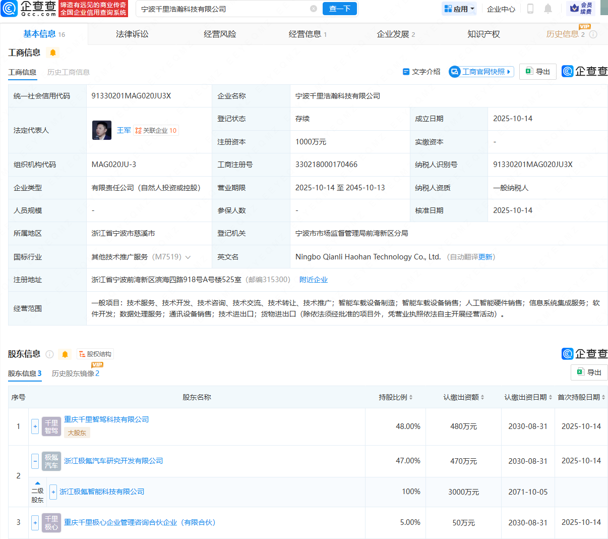 企查查APP显示,近日,宁波千里浩瀚科技有限公司成立,法定代表人为王军,注册资本为1000万元,经营范围包含:智能车载设备制造;智能车载设备销售;人工智能硬件销售;信息系统集成服务;软件开发等。企查查股权穿透显示,该公司由重庆千里智驾科技有限公司、极氪汽车旗下浙江极氪汽车研究开发有限公司等共同持股。