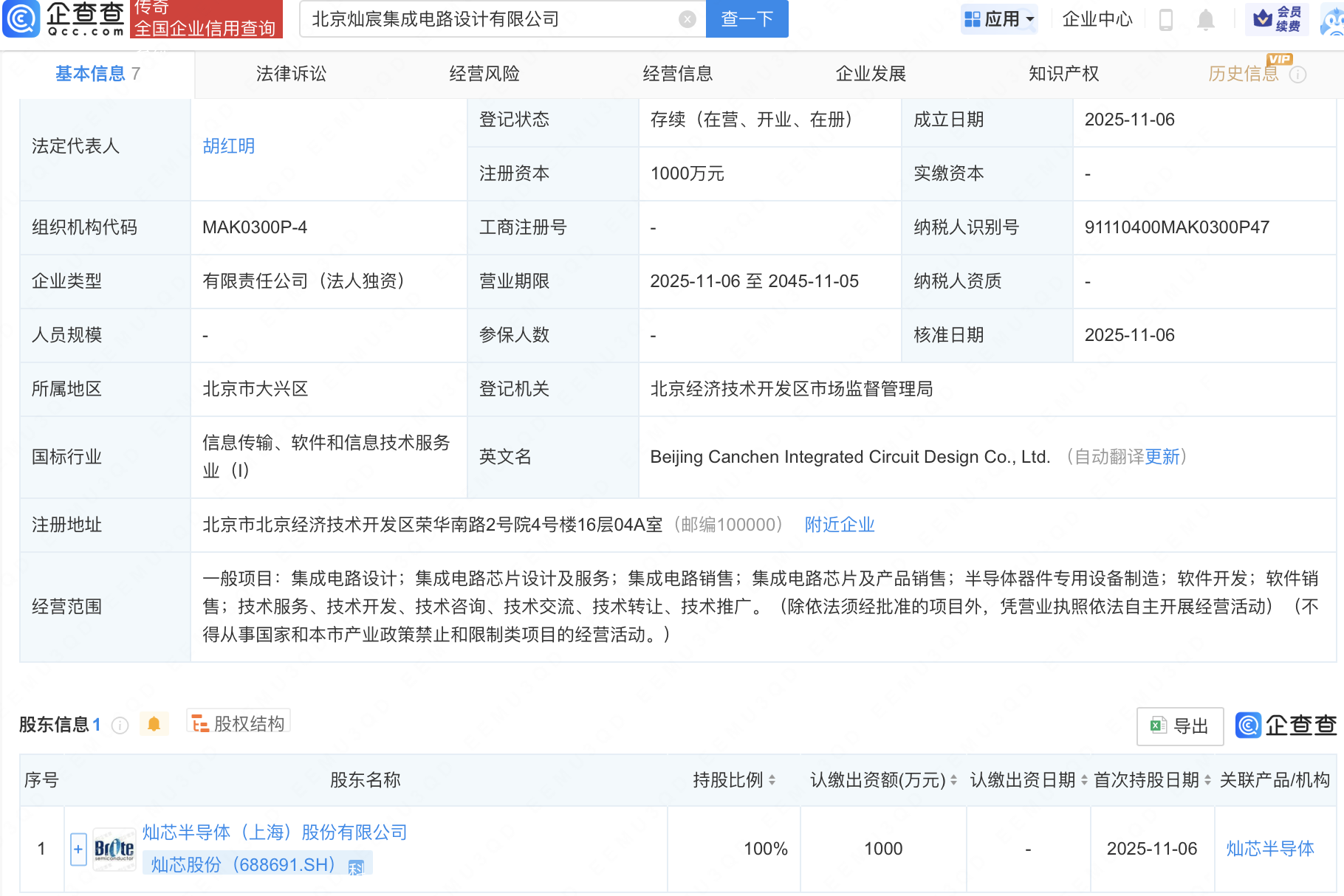 企查查APP显示,近日,北京灿宸集成电路设计有限公司成立,注册资本1000万元,经营范围包含:集成电路设计;集成电路芯片设计及服务;集成电路销售;集成电路芯片及产品销售等。企查查股权穿透显示,该公司由灿芯股份(688691)全资持股。