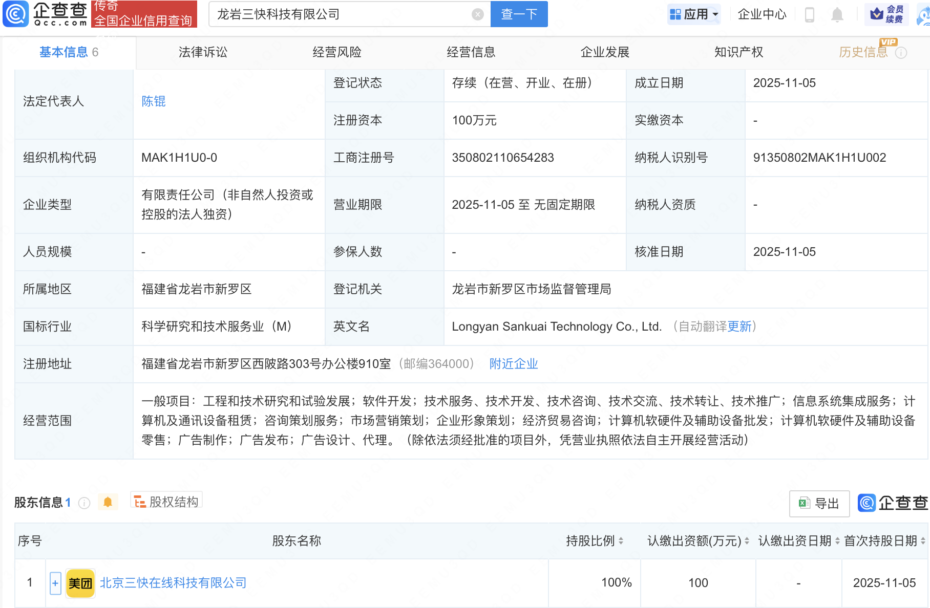 企查查APP显示,近日,龙岩三快科技有限公司成立,法定代表人为陈锟,经营范围包含:工程和技术研究和试验发展;信息系统集成服务;计算机及通讯设备租赁等。企查查股权穿透显示,该公司由美团关联公司北京三快在线科技有限公司全资持股。