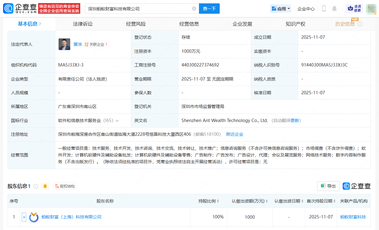 企查查APP显示,11月7日,深圳蚂蚁财富科技有限公司成立,法定代表人为黄浩,注册资本1000万人民币,经营范围涉及信息咨询服务、市场调查、软件开发、计算机软硬件及辅助设备批发、网络技术服务、数字内容制作服务等。企查查股权穿透显示,该公司由蚂蚁财富(上海)科技有限公司全资持股。