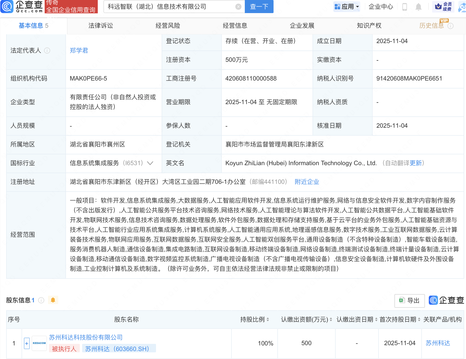 企查查APP显示,近日,科远智联(湖北)信息技术有限公司成立,经营范围包含:人工智能理论与算法软件开发;人工智能公共数据平台;人工智能基础软件开发;物联网技术服务等。企查查股权穿透显示,该公司由苏州科达(603660)全资持股。