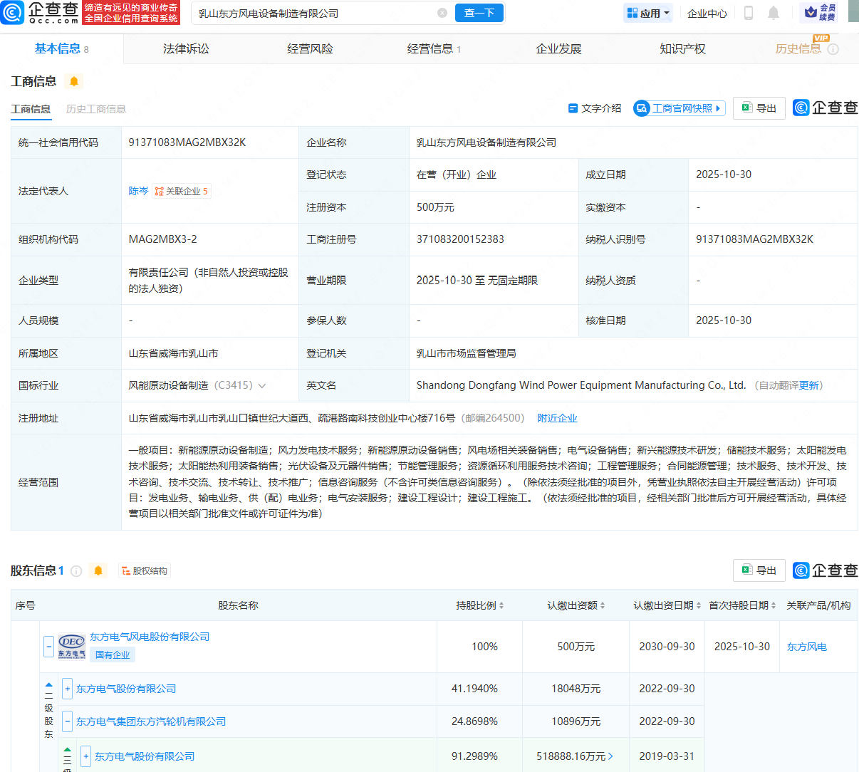 企查查APP显示,近日,乳山东方风电设备制造有限公司成立,法定代表人为陈岑,经营范围包含:新能源原动设备制造;风力发电技术服务;风电场相关装备销售;电气设备销售等。企查查股权穿透显示,该公司由东方电气(600875)旗下东方电气风电股份有限公司全资持股。