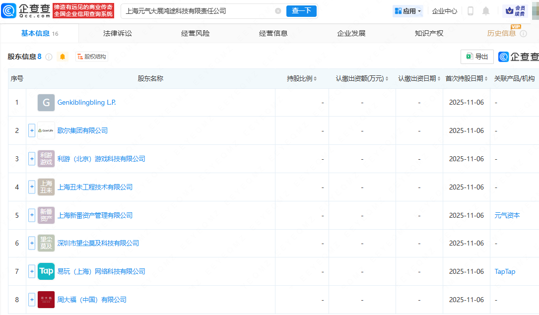 企查查APP显示,近日,上海元气大展鸿途科技有限责任公司成立,法定代表人为胡筱祎,注册资本为4004万元,经营范围包含:软件开发;企业管理咨询;信息咨询服务(不含许可类信息咨询服务);企业形象策划等。企查查股权穿透显示,该公司由歌尔集团有限公司、周大福(中国)有限公司等共同持股。