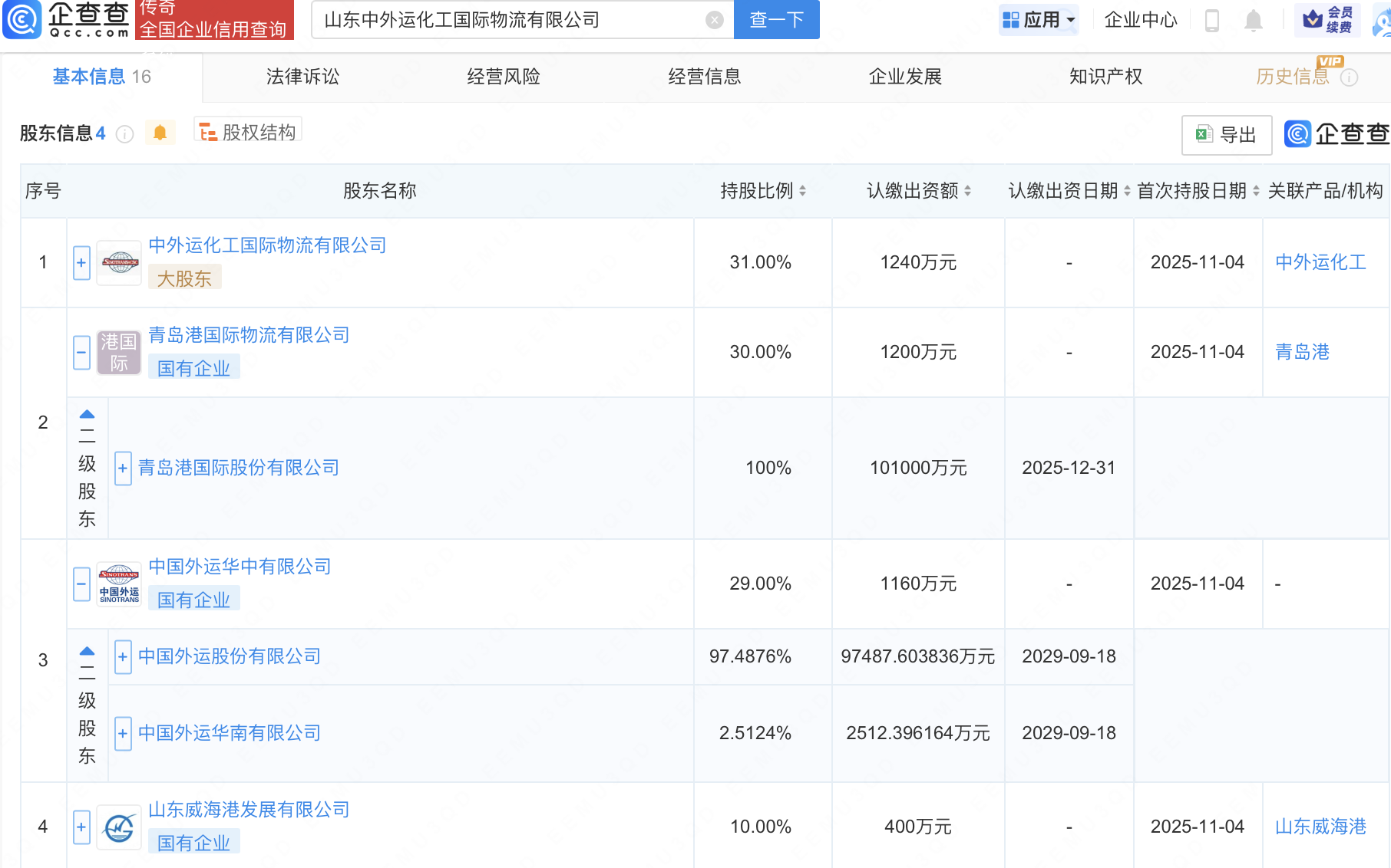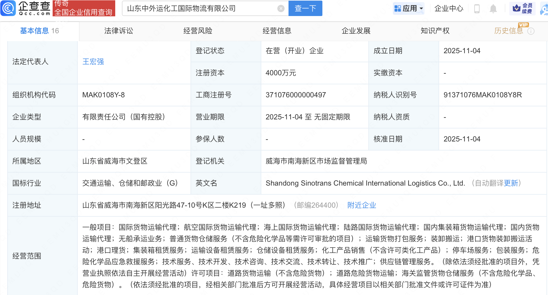 企查查APP显示,近日,山东中外运化工国际物流有限公司成立,注册资本4000万元,经营范围包含:国际货物运输代理;航空国际货物运输代理;海上国际货物运输代理;陆路国际货物运输代理等。企查查股权穿透显示,该公司由青岛港(601298)全资子公司青岛港国际物流有限公司、中国外运(601598)旗下中国外运华中有限公司等共同持股。