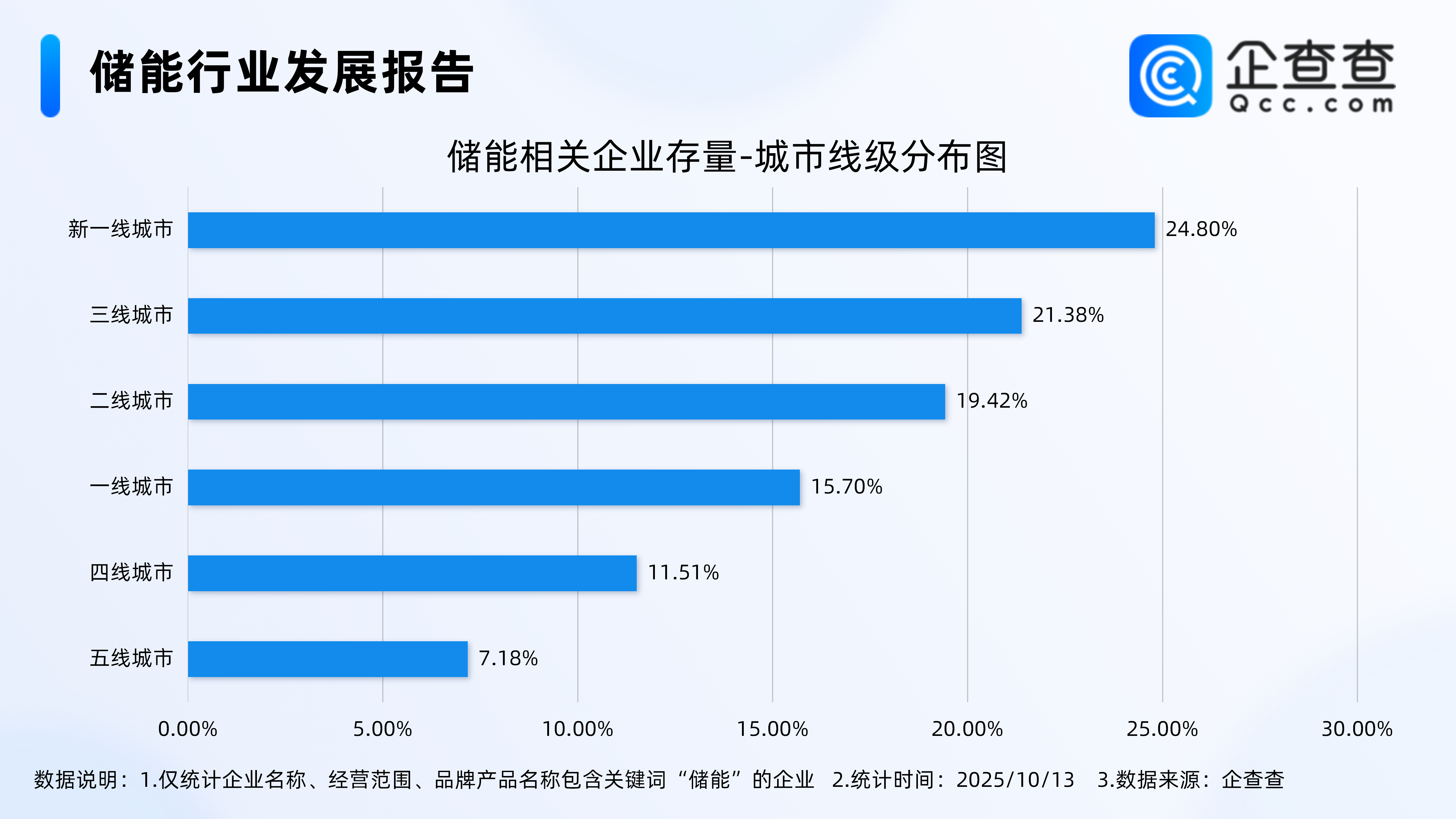 企查查数据显示,从城市线级分布来看,分布在新一线城市的储能相关企业最多,占比24.80%。其次,分布在三线城市、二线城市的相关企业分别占比21.38%、19.42%。