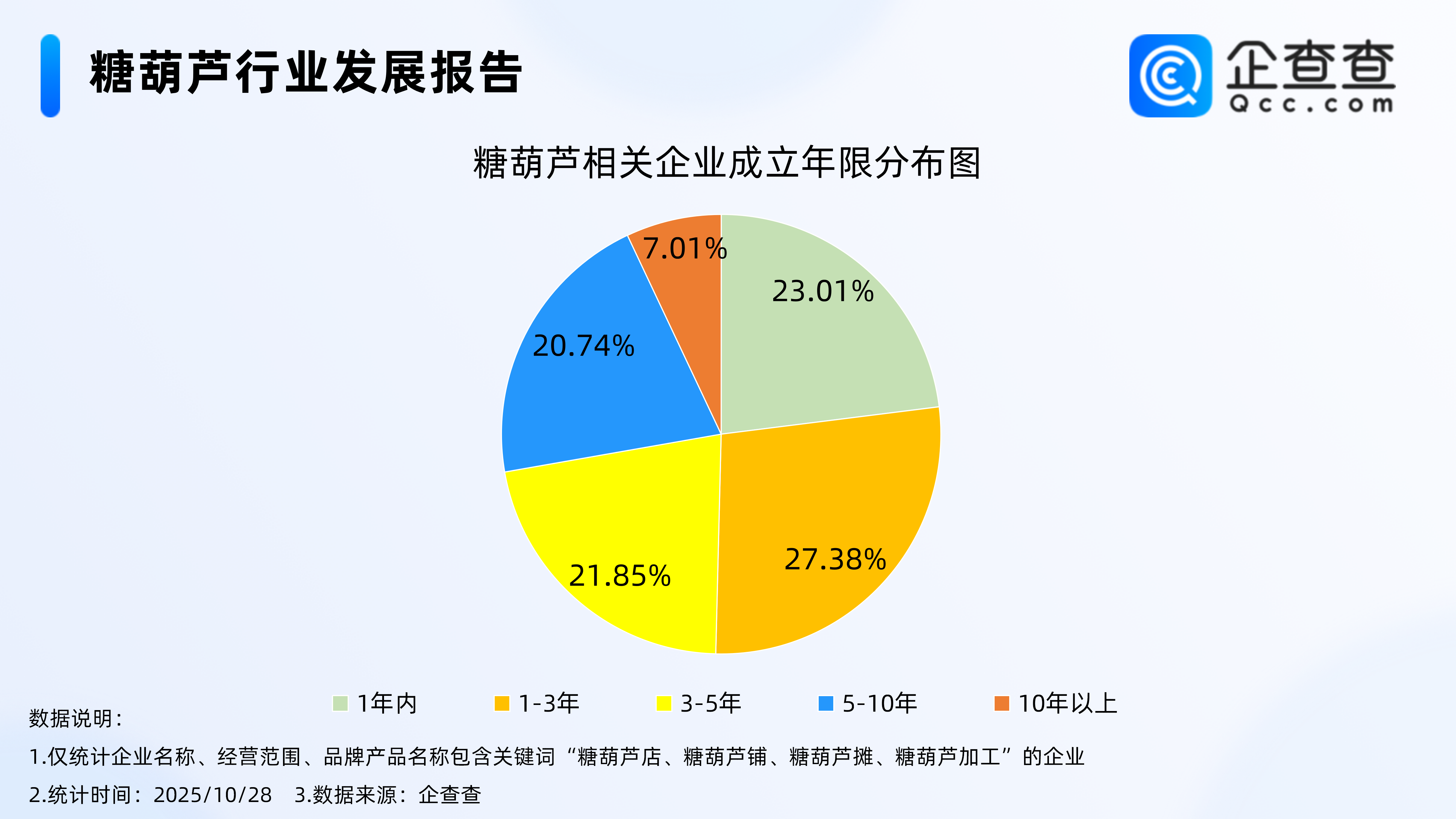 企查查数据显示,从经营时间来看,糖葫芦相关企业多成立于近三年,成立年限在1-3年的相关企业最多,占比达27.38%。其次,成立年限在1年内的糖葫芦相关企业占比23.01%。