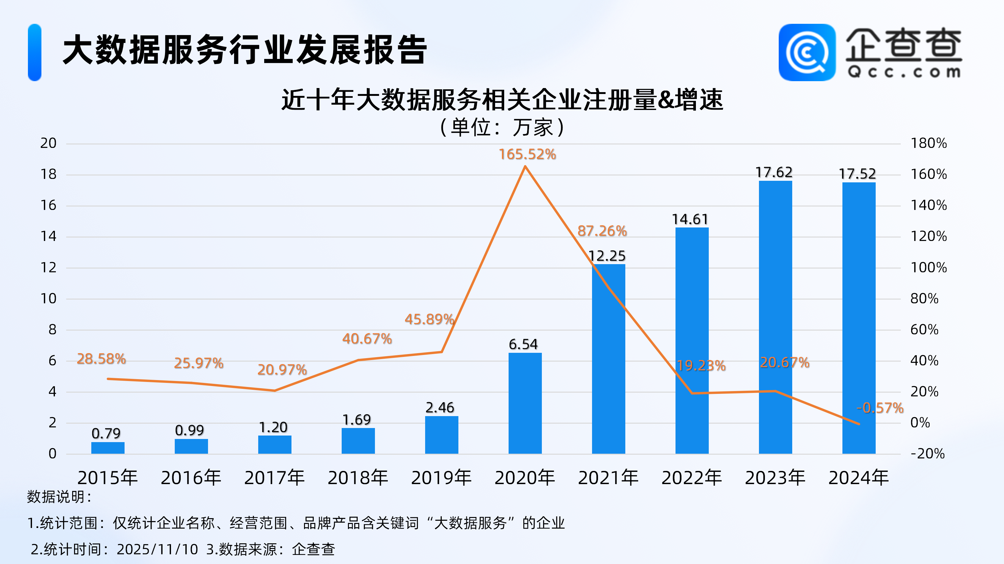 企查查数据显示,注册量方面,近十年大数据服务相关企业年注册量整体呈上升趋势,2020年注册量达6.54万家,同比增长165.52%,达近十年注册量增速峰值。2021年-2023年注册量进入平稳增长期,2024年注册量达17.52万家。