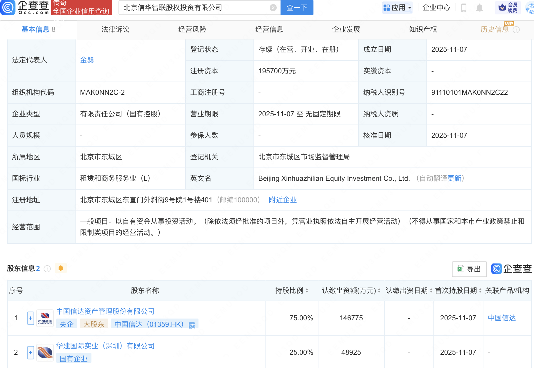 企查查APP显示,近日,北京信华智联股权投资有限公司成立,注册资本19.57亿元,经营范围包含:以自有资金从事投资活动。企查查股权穿透显示,该公司由中国信达(01359.HK)、华建国际实业(深圳)有限公司共同持股。